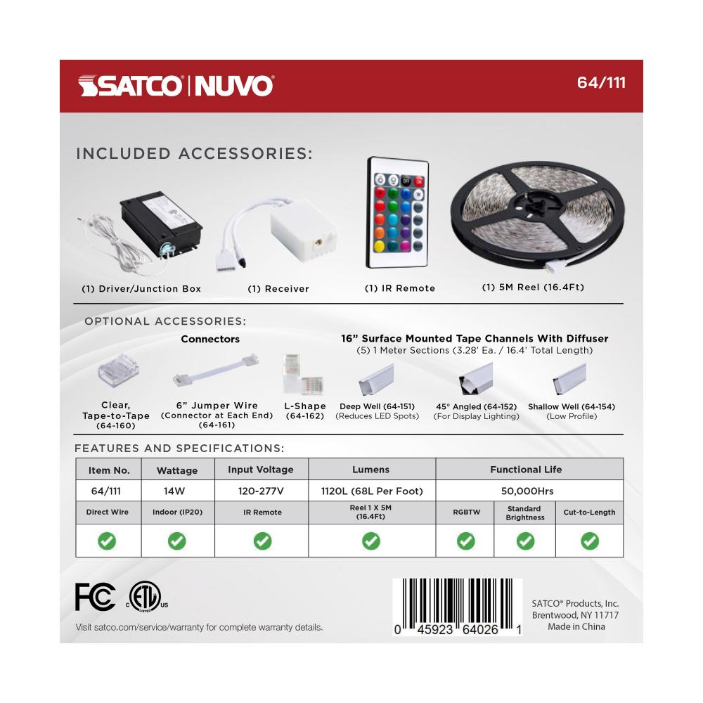 Visit Satco.com for optional accessories from a variety of channels with diffusers (64-150, 64-151, 64-152, 64-154), tape-to-tape connector (64-160), 6-in jumper wire (64-161), 90 degree connector (64-162), wire-to-tape connector (64-164), and 50 foot tape