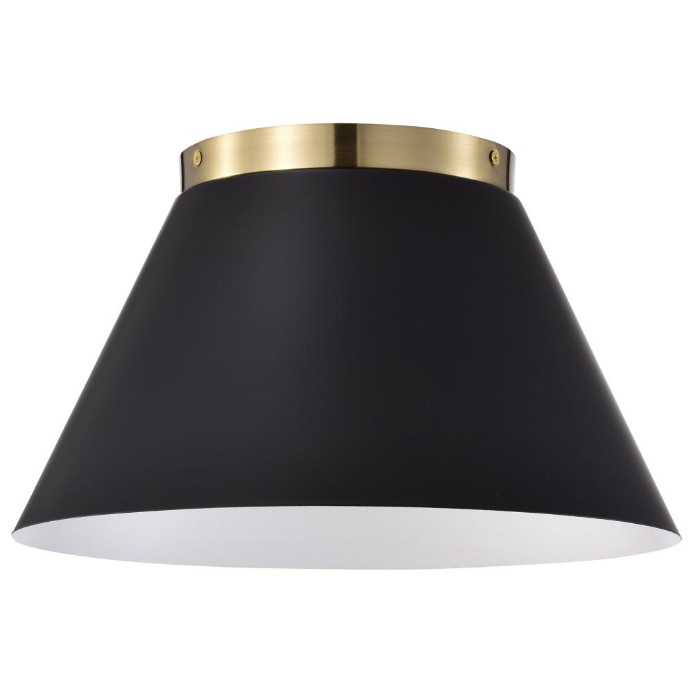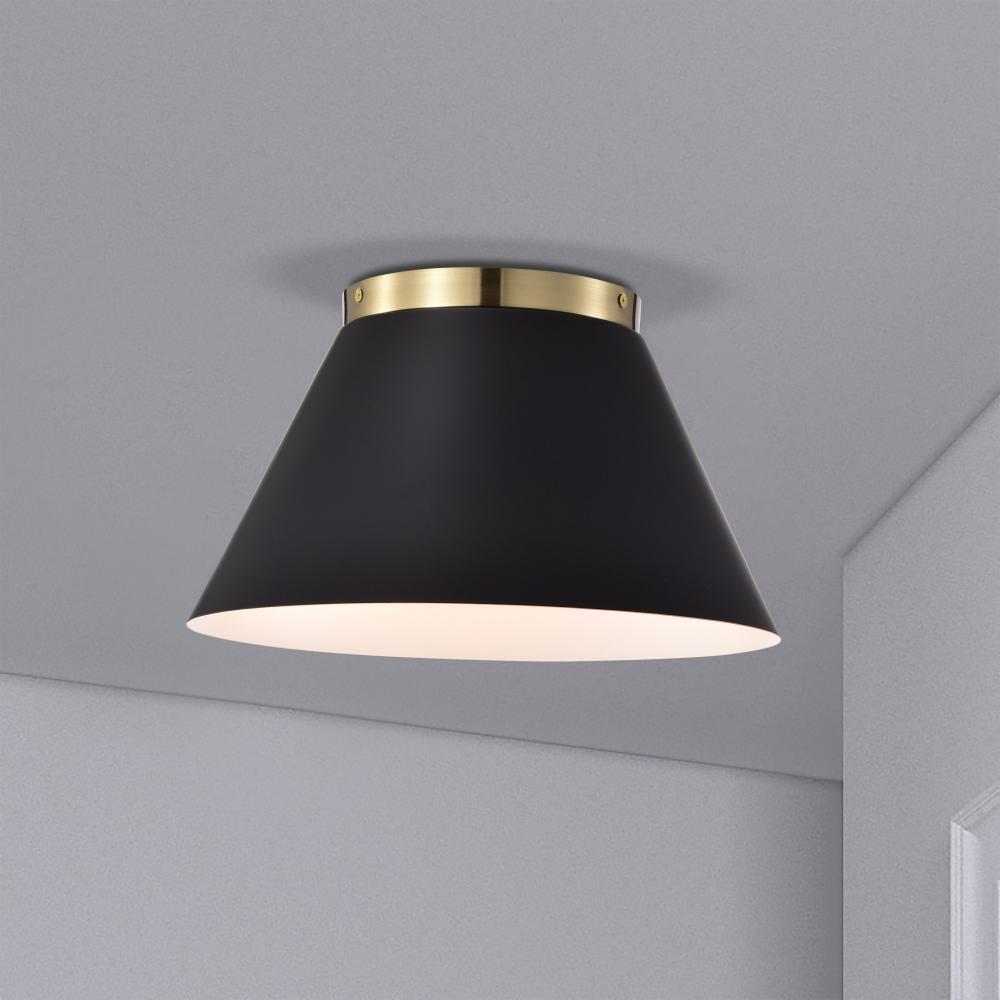 With subtle detailing, the Dover 60-7417 small flush mount is graceful yet unassuming. The simple black shade features a white lining to reflect the light, and the trim is finished in vintage brass to match the fixture's body. Place over a table in an