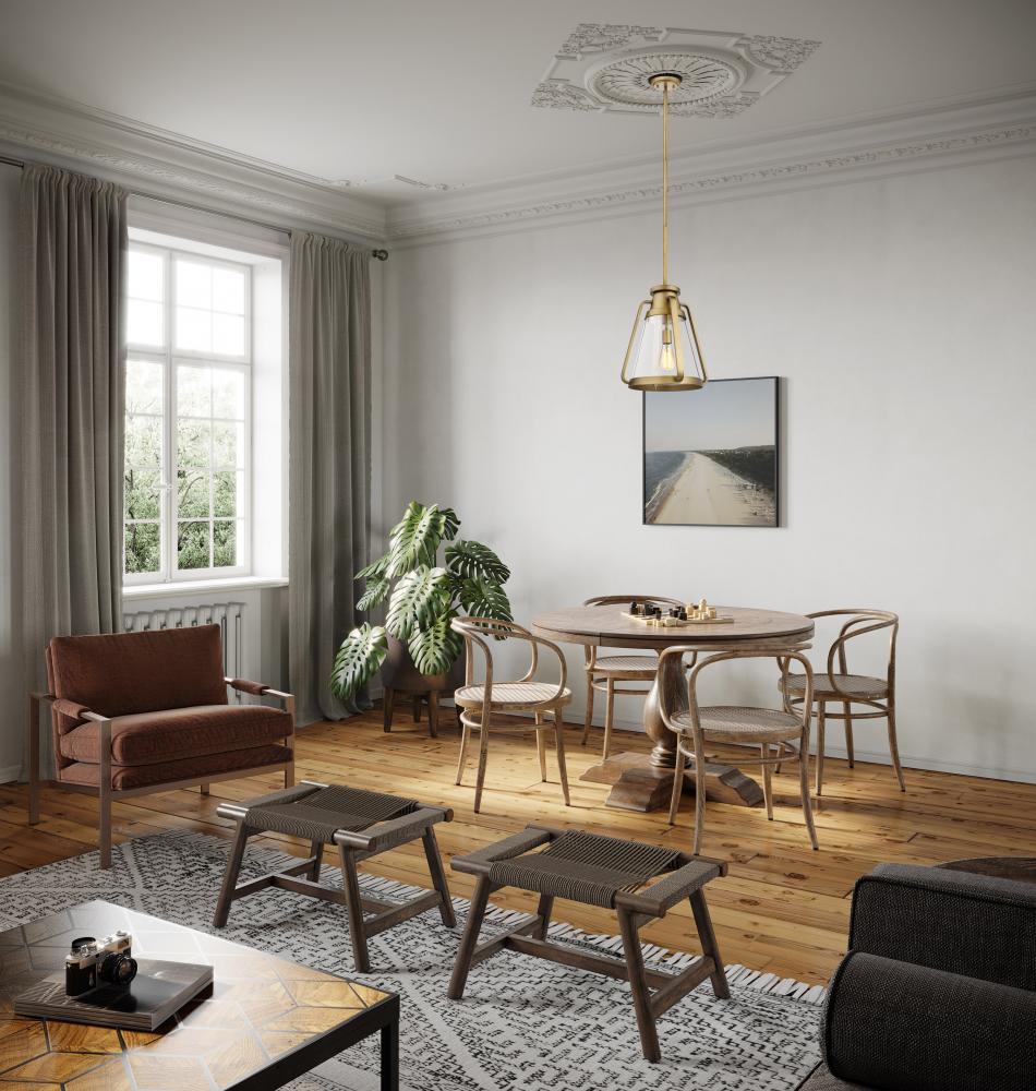 Glass and overlaying metal create a nice depth with the Everett small pendant. The clear, tapered glass provides 360-degree illuminations. When paired with a vintage bulb, a touch of nostalgia complements the transitional design. A natural brass finish on