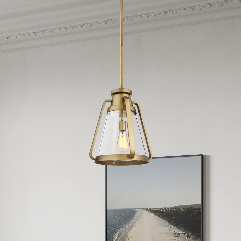 Glass and overlaying metal create a nice depth with the Everett 60-7562 small pendant. The clear, tapered glass provides 360-degree illuminations. When paired with a vintage bulb, a touch of nostalgia complements the transitional design. A natural brass fi