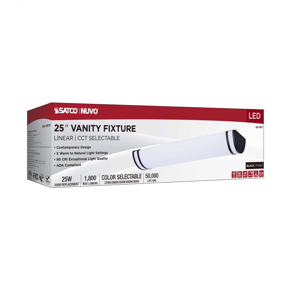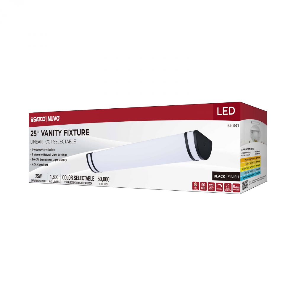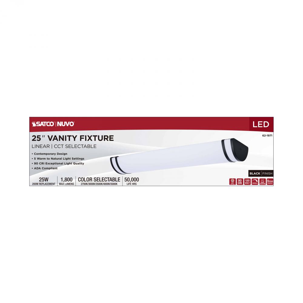 The SATCO NUVO 62-1971 Glamour 25-inch Vanity Fixture in white with a black finish offers sleek, modern lighting with 5 CCT selectable technology (2700K–5000K) and 90 CRI illumination for vibrant color rendering. This 25-watt fixture replaces 200W incand