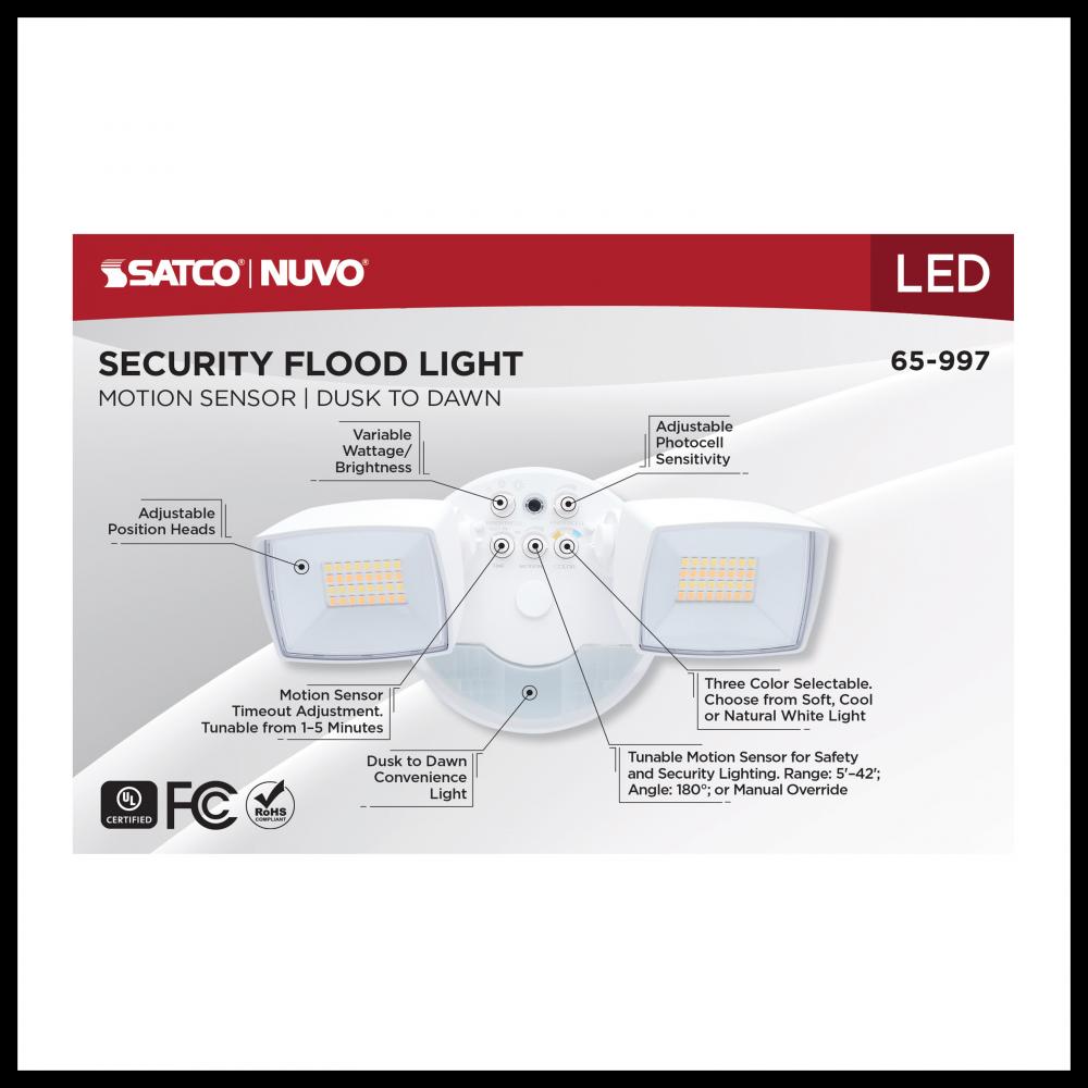 SATCO NUVO's field selectable dual head LED security flood lights set a new standard for reliable and versatile safety lighting. Ideal for both residential and commercial applications, these fixtures can be mounted on walls or eaves to illuminate criti