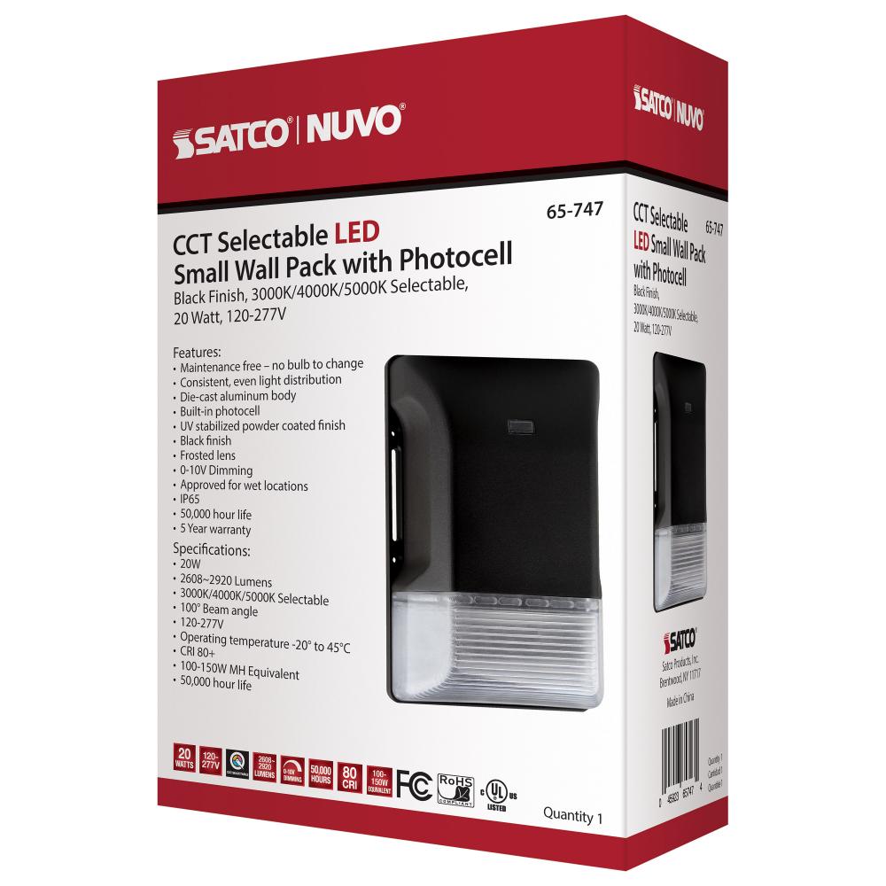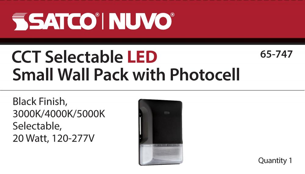 SATCO NUVO's 65-747 20W LED Small Wall Pack is now CCT Selectable. Available in a black finish and featuring lighting choices from warm, cool, and natural light, this fixture is perfect for all of your lighting needs. This premium Wall Pack has a built