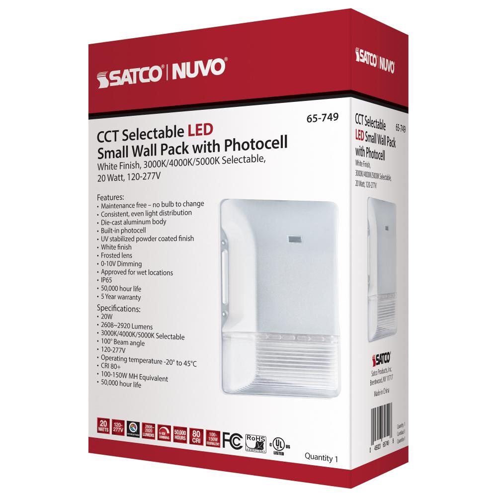 SATCO NUVO's 65-749 20W LED Small Wall Pack is now CCT Selectable. Available in a white finish and featuring lighting choices from warm, cool, and natural light, this fixture is perfect for all of your lighting needs. This premium Wall Pack has a built