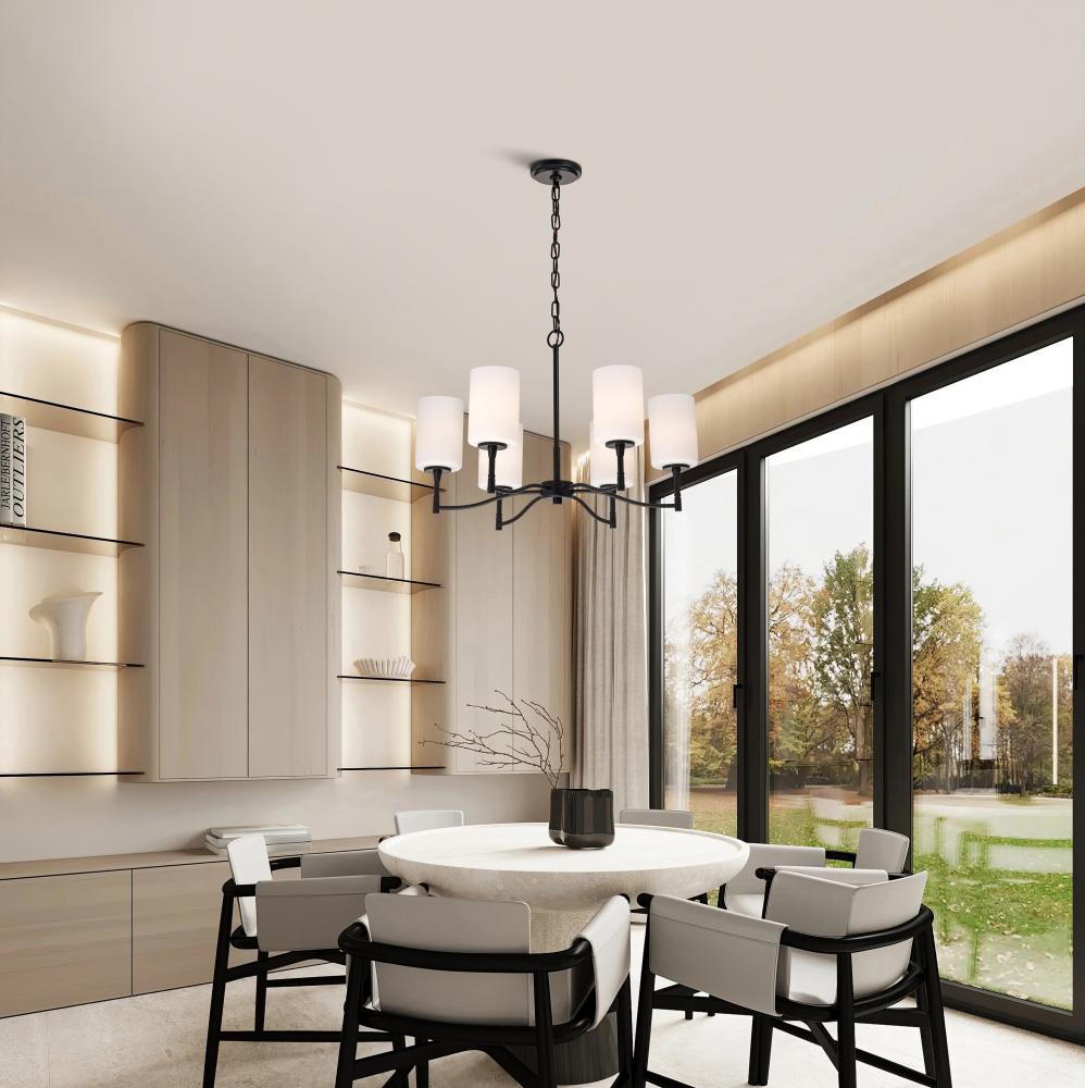 Seamlessly blending transitional design with contemporary accents, the Liam 60-8216 six light chandelier exudes understated elegance. A sophisticated matte black finish, perfectly complements the soft glow of white opal glass. With its broad appeal and ver