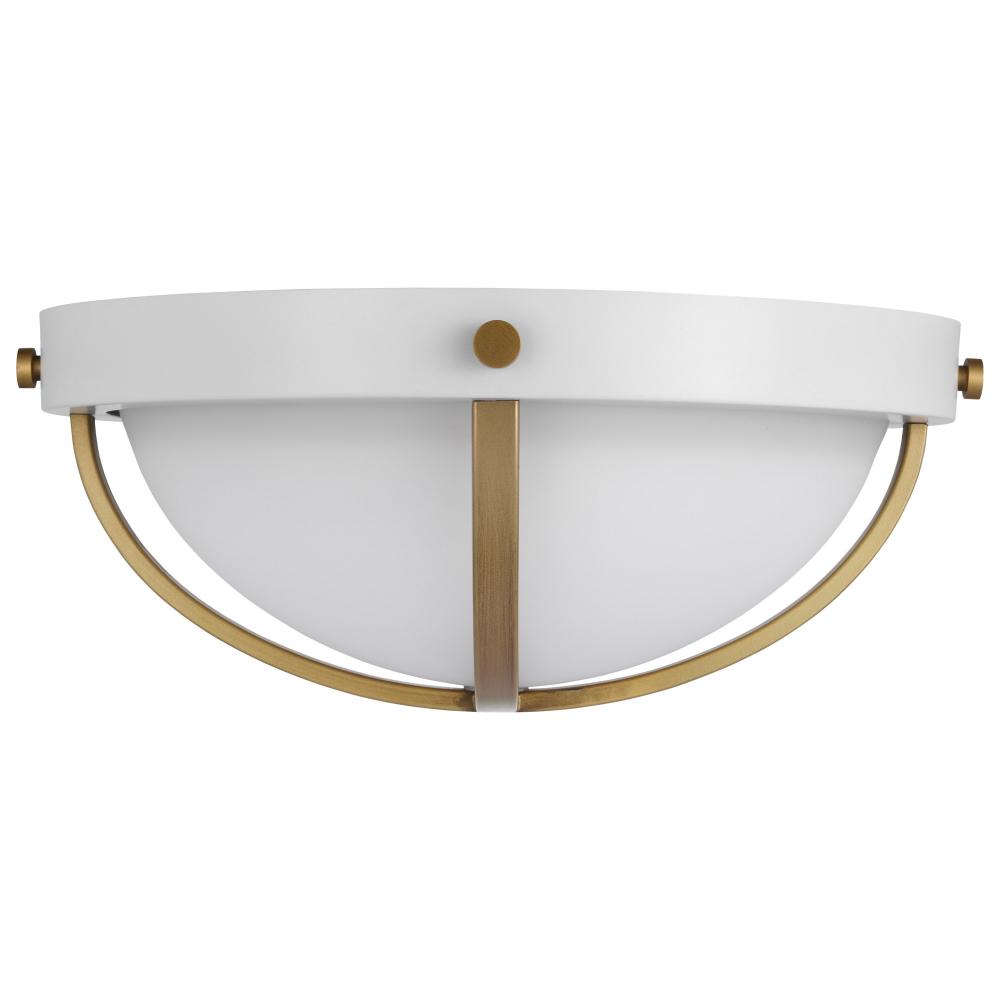 The striking Lincoln 60-7662 flush mount was inspired by an armillary sphere, consisting of a framework of elegant rings. Broad, circular bands surround the orb, and knob details in a brass hue enhance the opal glass and matte white finish for a prominent,