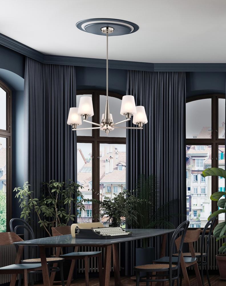 Embrace the classic elegance of the Lune 60-8225 five light chandelier, where updated Mid-Century Modern design meets today's sophisticated style. Featuring graceful lines and thoughtful details, it reimagines retro aesthetics for the contemporary home