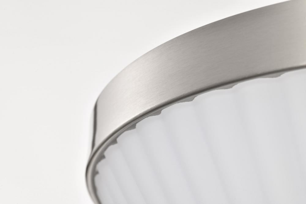 Indulge in the glamour of the Royale Collection, where sleek Art Deco silhouettes meet modern refinement. The satin white pleated glass adds texture and sophistication, diffusing light with a soft, radiant glow. Available in brushed nickel and burnished br