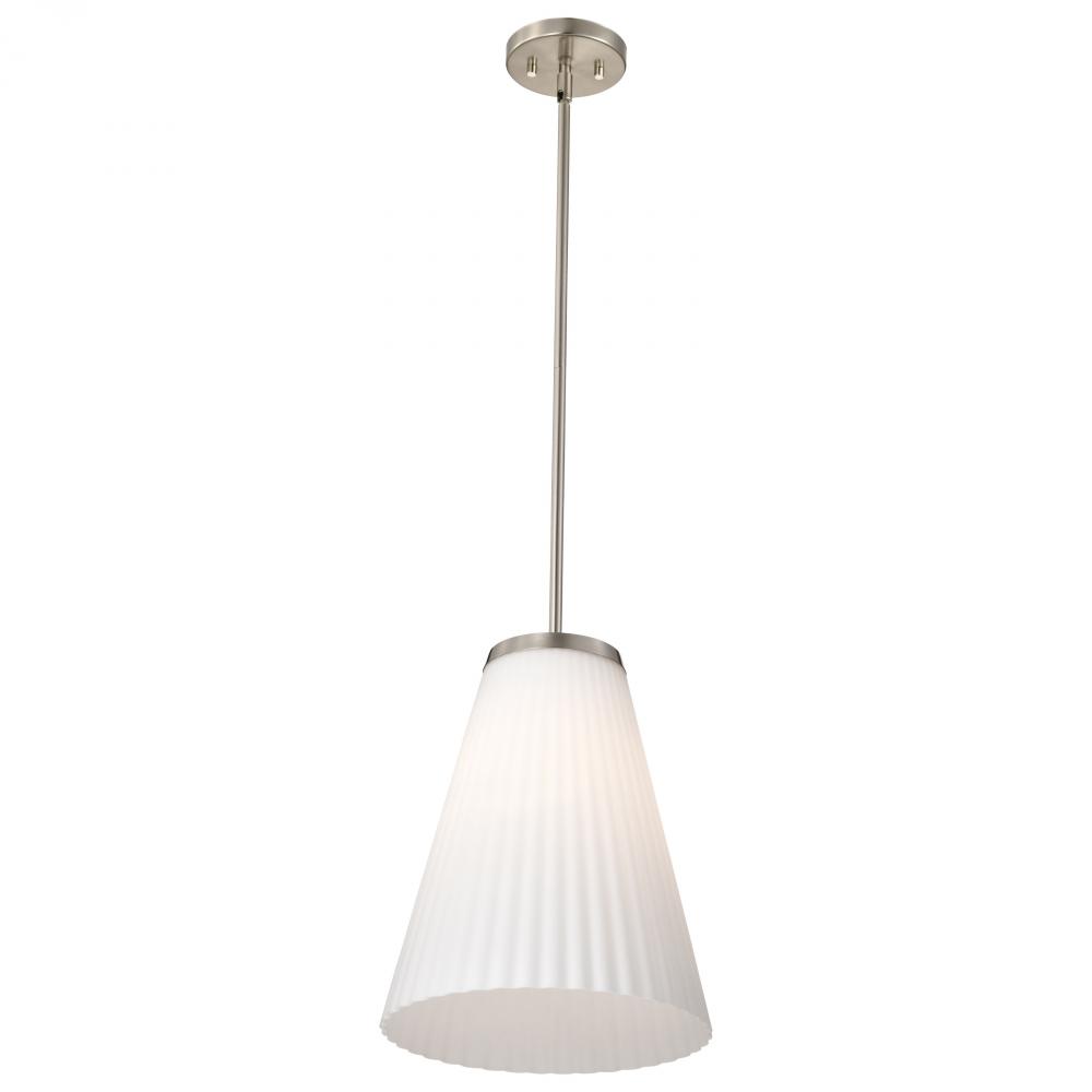 Indulge in the glamour of the Royale 60-8738 one light large pendant, where sleek Art Deco silhouettes meet modern refinement. The satin white pleated glass adds texture and sophistication, diffusing light with a soft, radiant glow. Finished in brushed nic