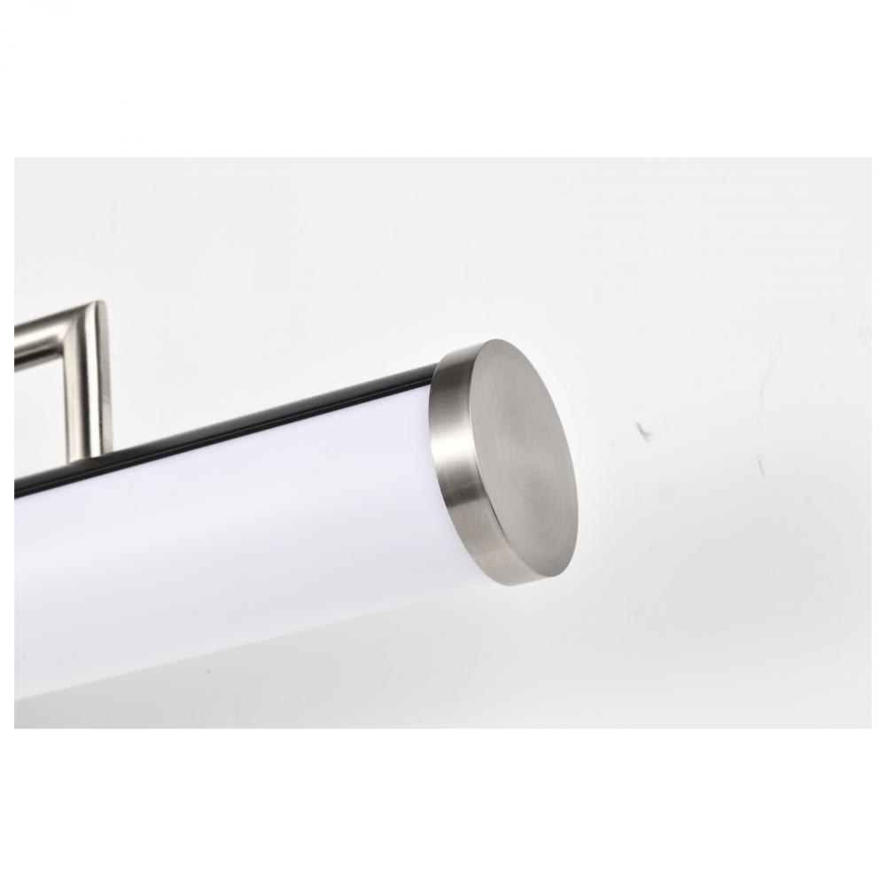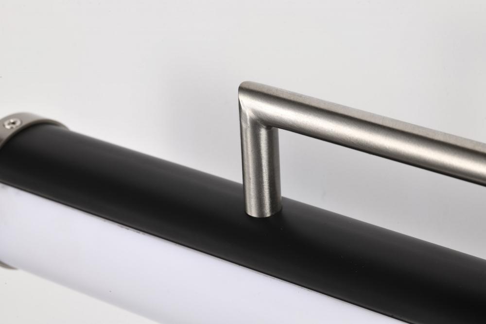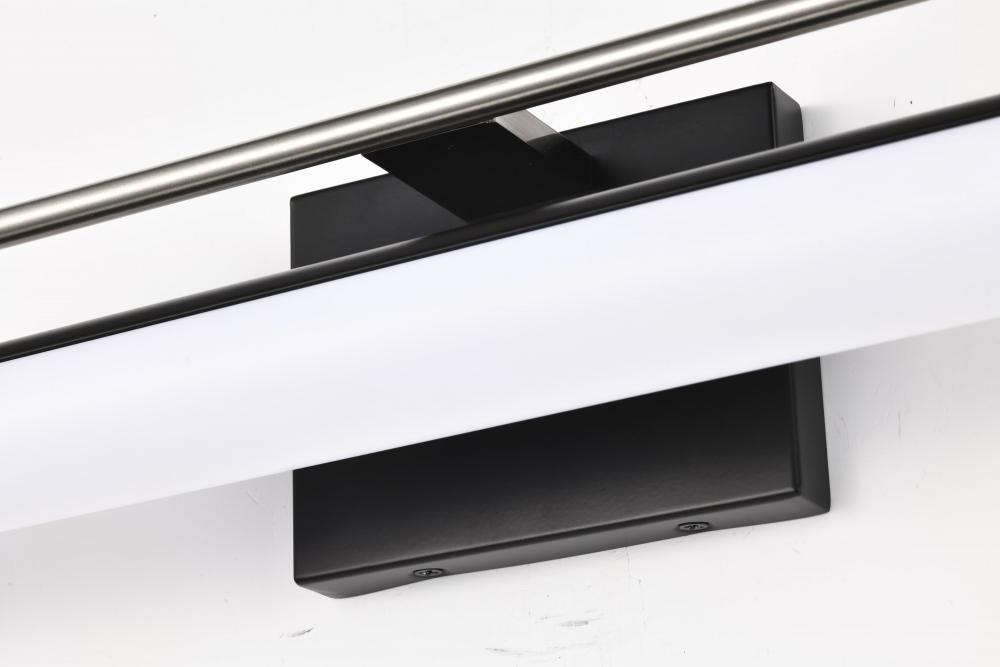 The design of the Solano 62-658 integrated LED medium bathroom vanity light is sleek and minimalist, with a simple yet elegant shape. The stylish fixture is finished in black with brushed nickel accents that accentuate the clean lines and broad backplate.