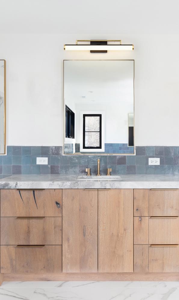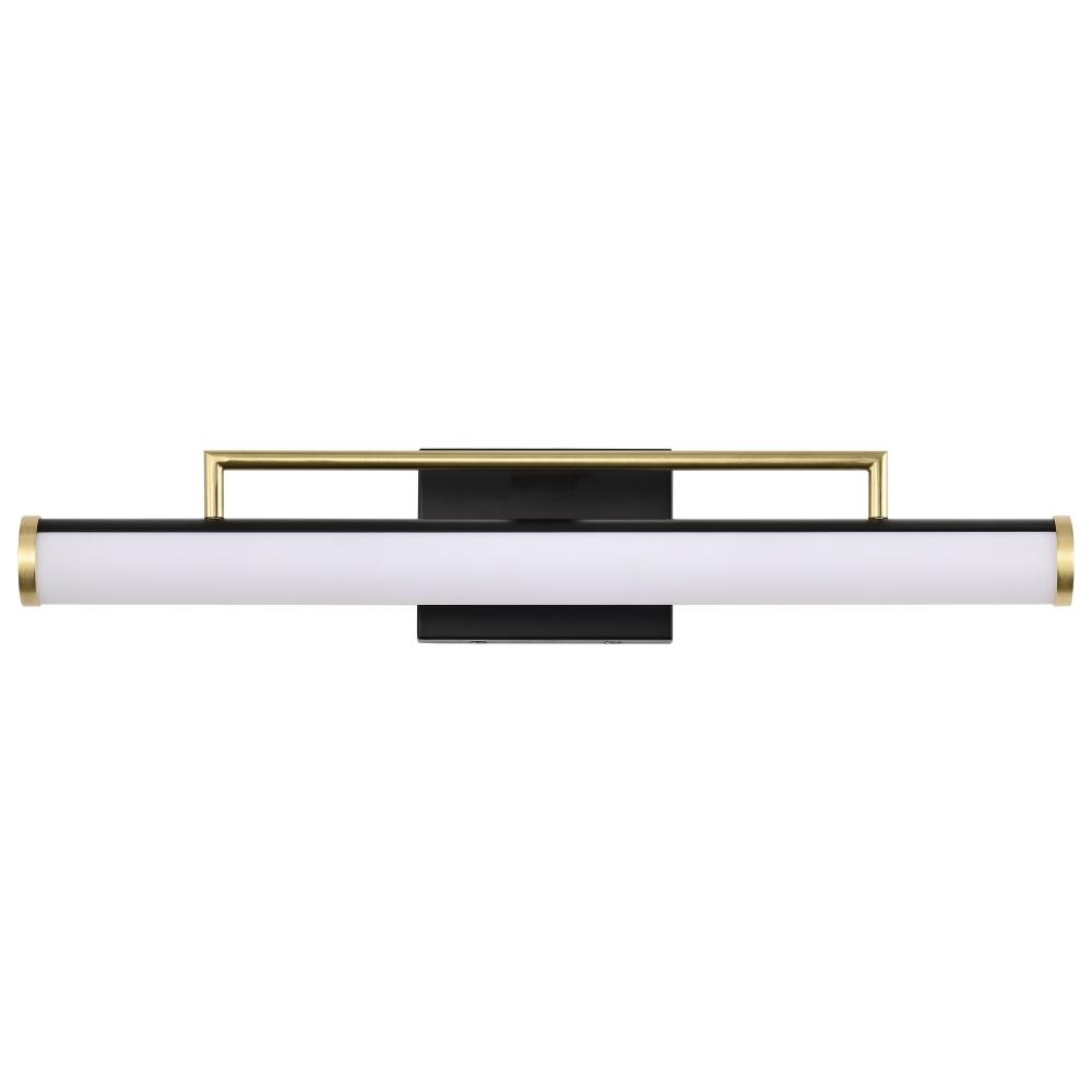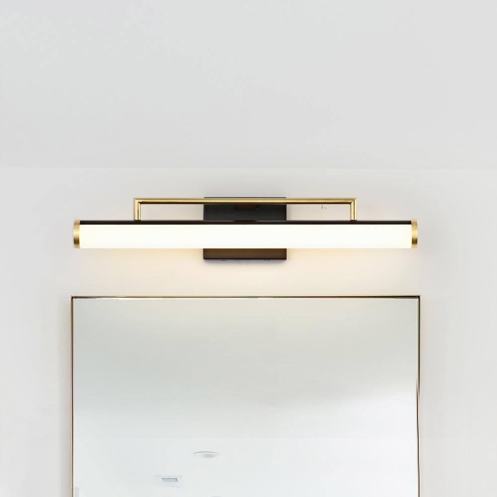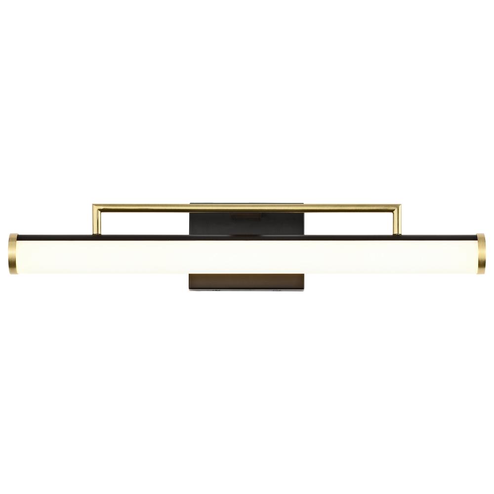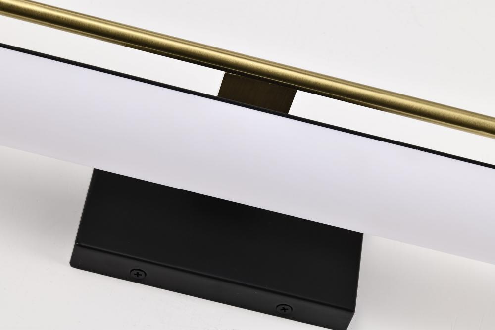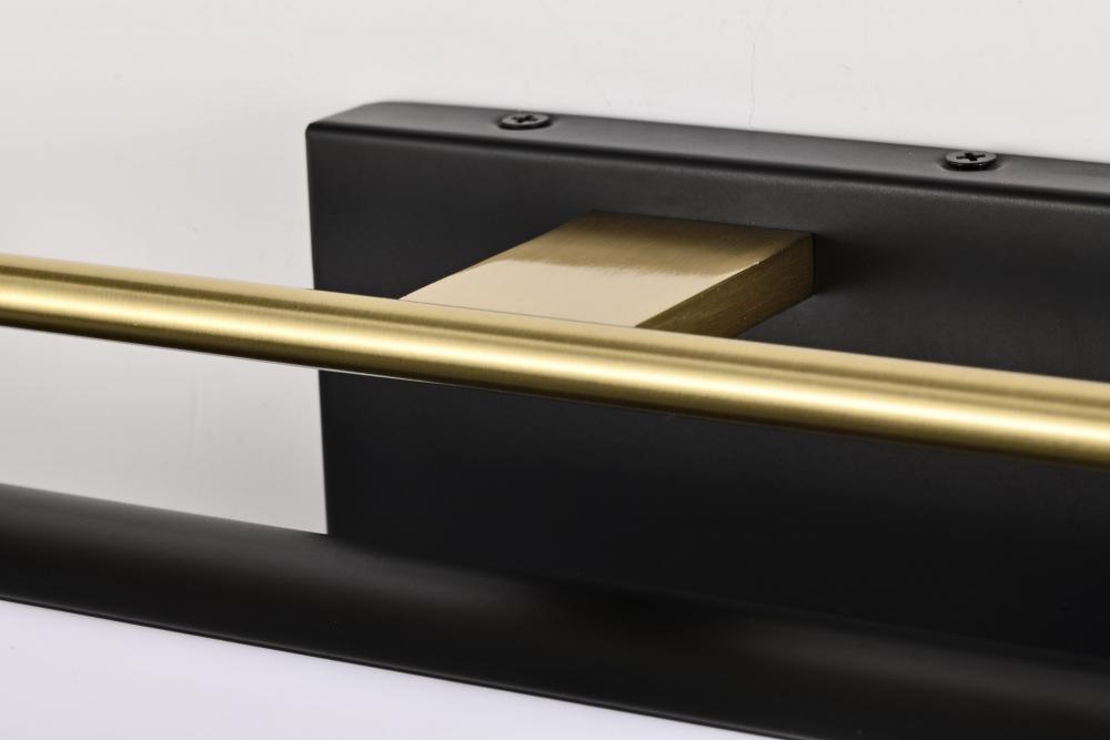 The design of the Solano integrated LED bathroom vanity lights series is sleek and minimalist, with a simple yet elegant shape. The stylish fixture is finished in black with brushed brass accents accentuate the clean lines and broad backplate. A white acry