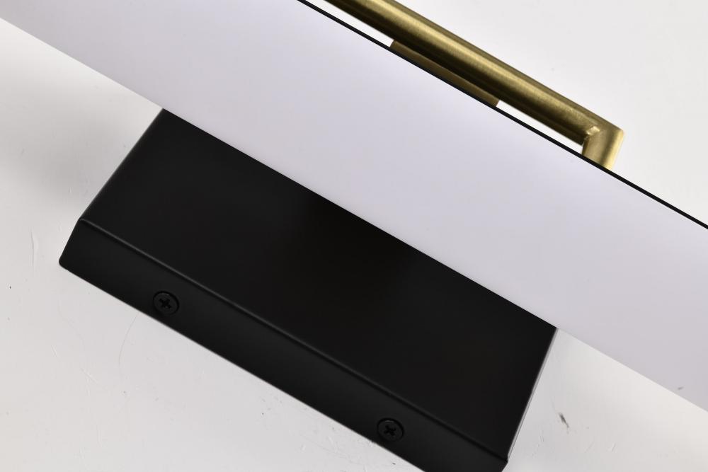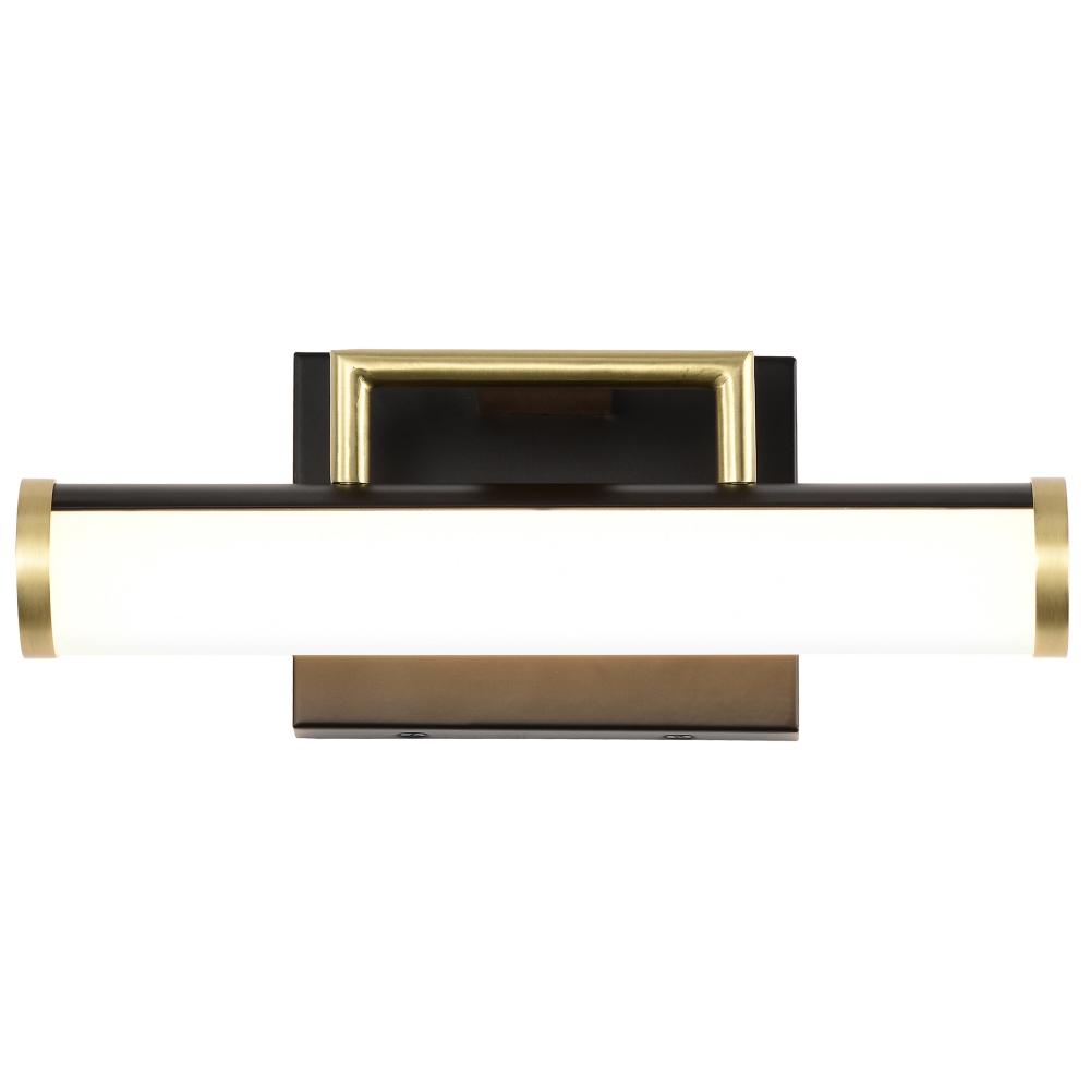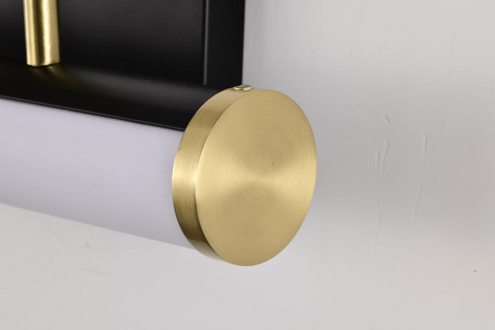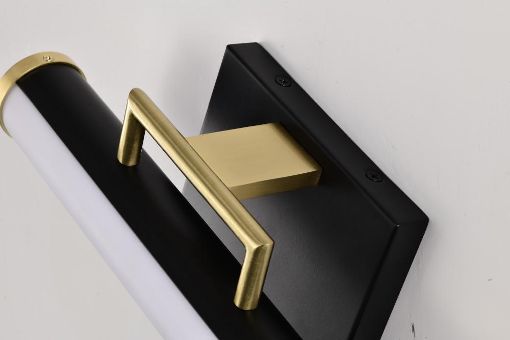 The design of the Solano 62-1537 integrated LED small bathroom vanity light is sleek and minimalist, with a simple yet elegant shape. The stylish fixture is finished in black with brushed brass accents accentuate the clean lines and broad backplate. A whit