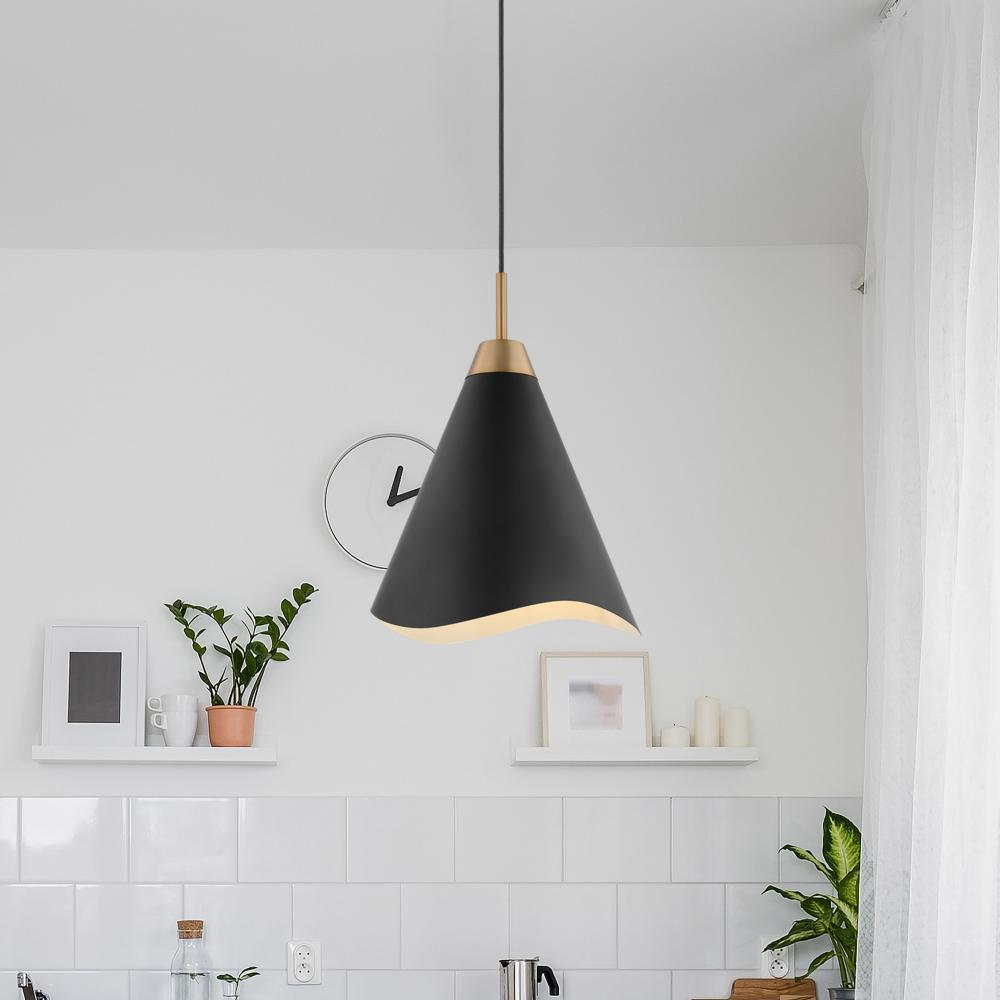 The Tango 60-7476 large pendant proves that simple style does not have to be boring. It features burnished brass accents on the base, cable collar and canopy, which gives the design some pop. The matte black metal shade is laser-cut in a subtle wave patter