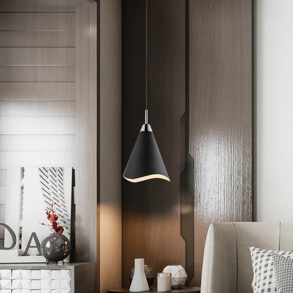 The Tango medium pendant proves that simple style does not have to be boring. It features polished nickel accents on the base, cable collar and canopy, which gives the design some pop. The matte black metal shade is laser-cut on its edge in a subtle wave p
