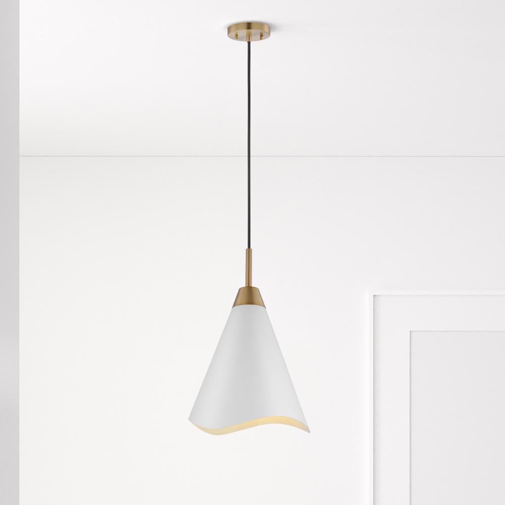The Tango 60-7474 medium pendant proves that simple style does not have to be boring. It features burnished brass accents on the base, cable collar and canopy giving the design some pop. The matte white metal shade is laser-cut on its edge in a subtle wave