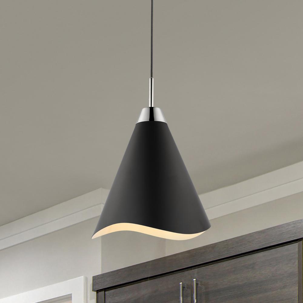 The Tango 60-7472 small pendant proves that simple style does not have to be boring. It features polished nickel accents on the base, cable collar and canopy, which gives the design some pop. The matte black metal shade is laser-cut on its edge in a subtle