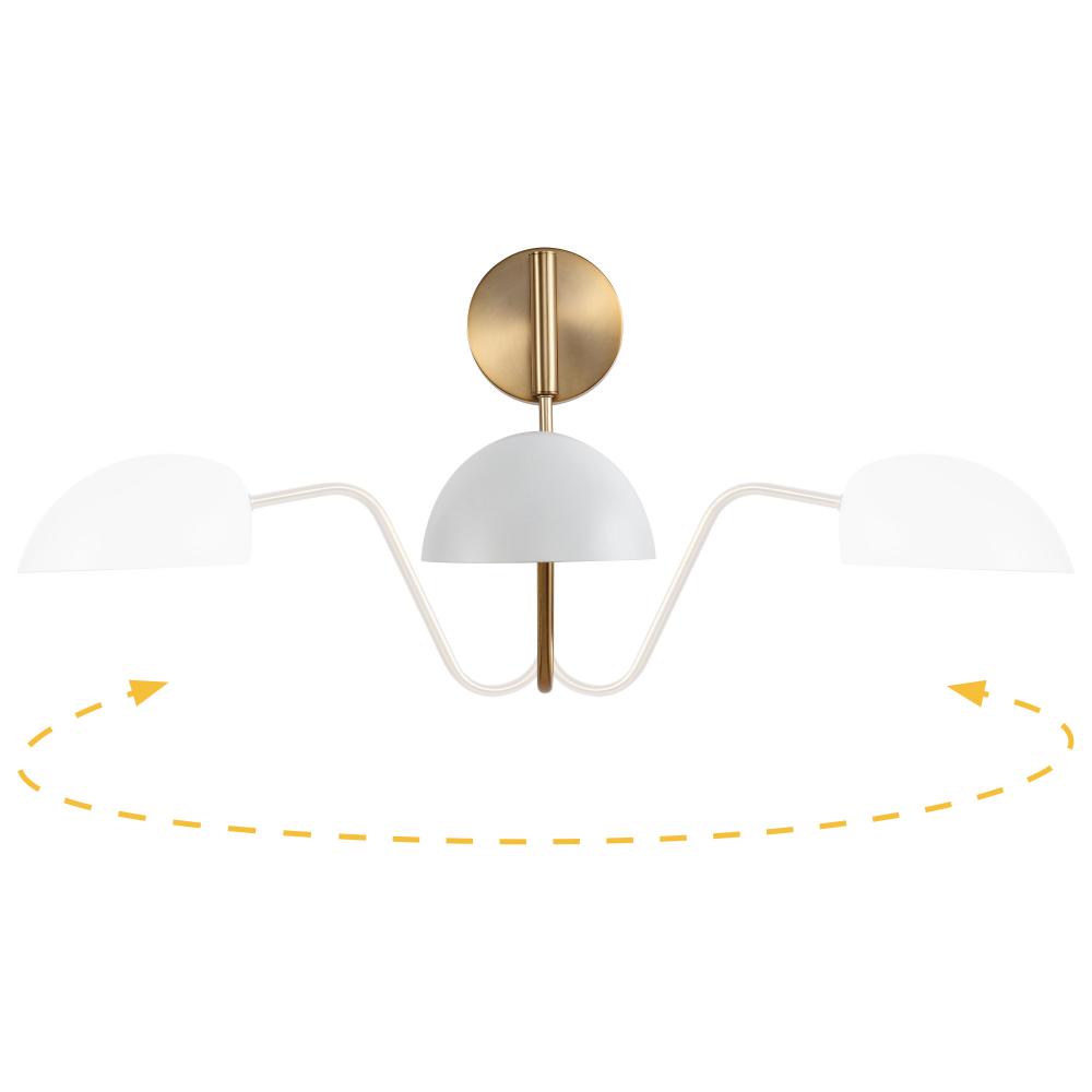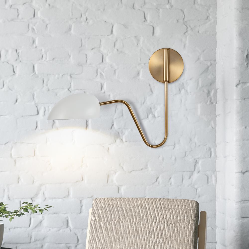 The Trilby wall light features an adjustable swing arm and a versatile finish and is perfect for a reading nook or office area. The half-bowl shade is matte white. The reflective interior lining is ideal for maximizing light output. With a burnished brass