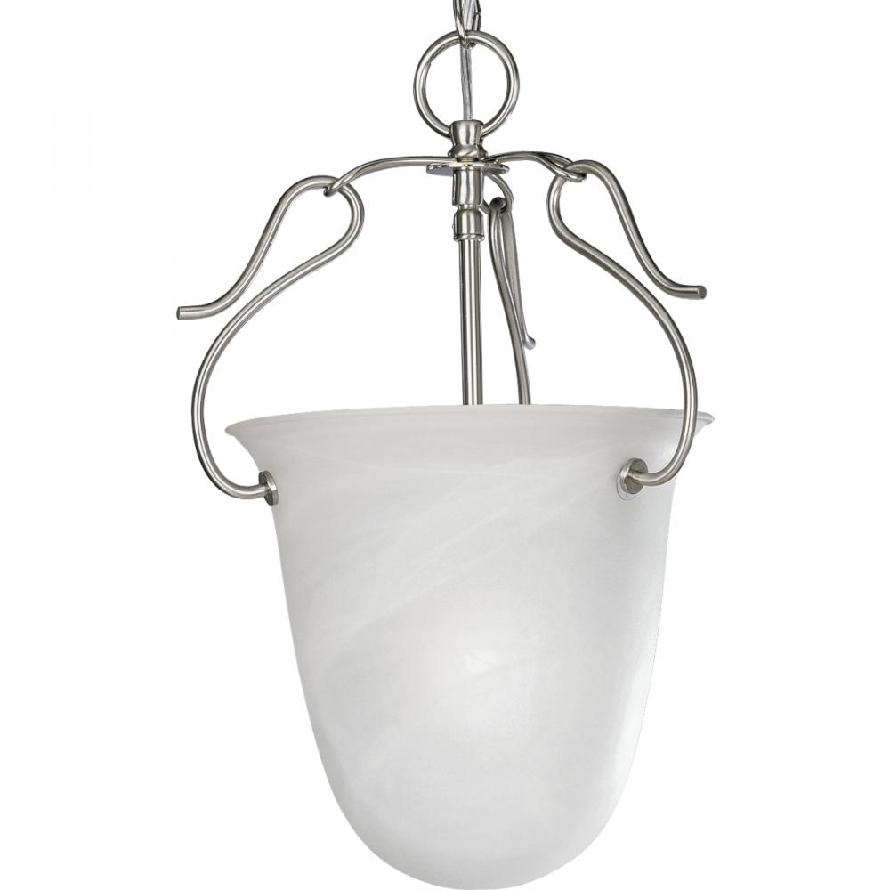 Brushed Nickel finish.;Alabaster glass.;Presents softly diffused light.;Finely crafted frame with striking metallic features.;Chain and ceiling mounts both included.