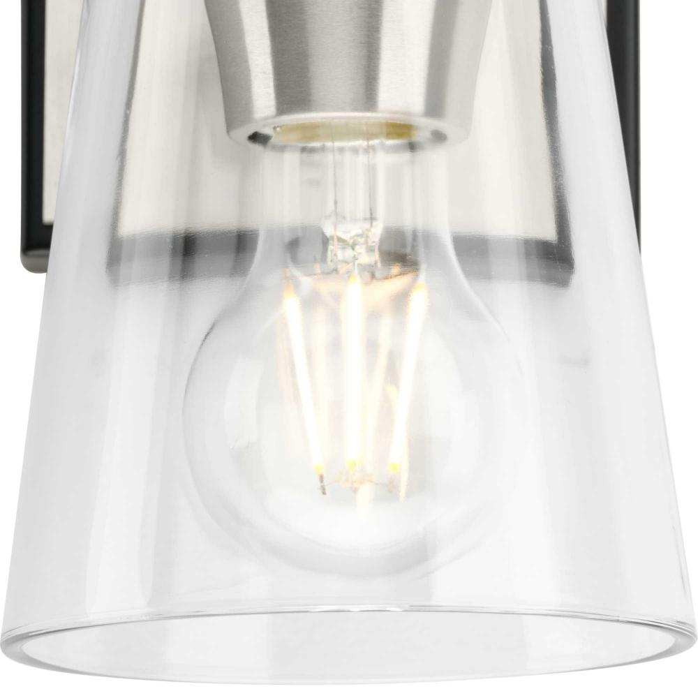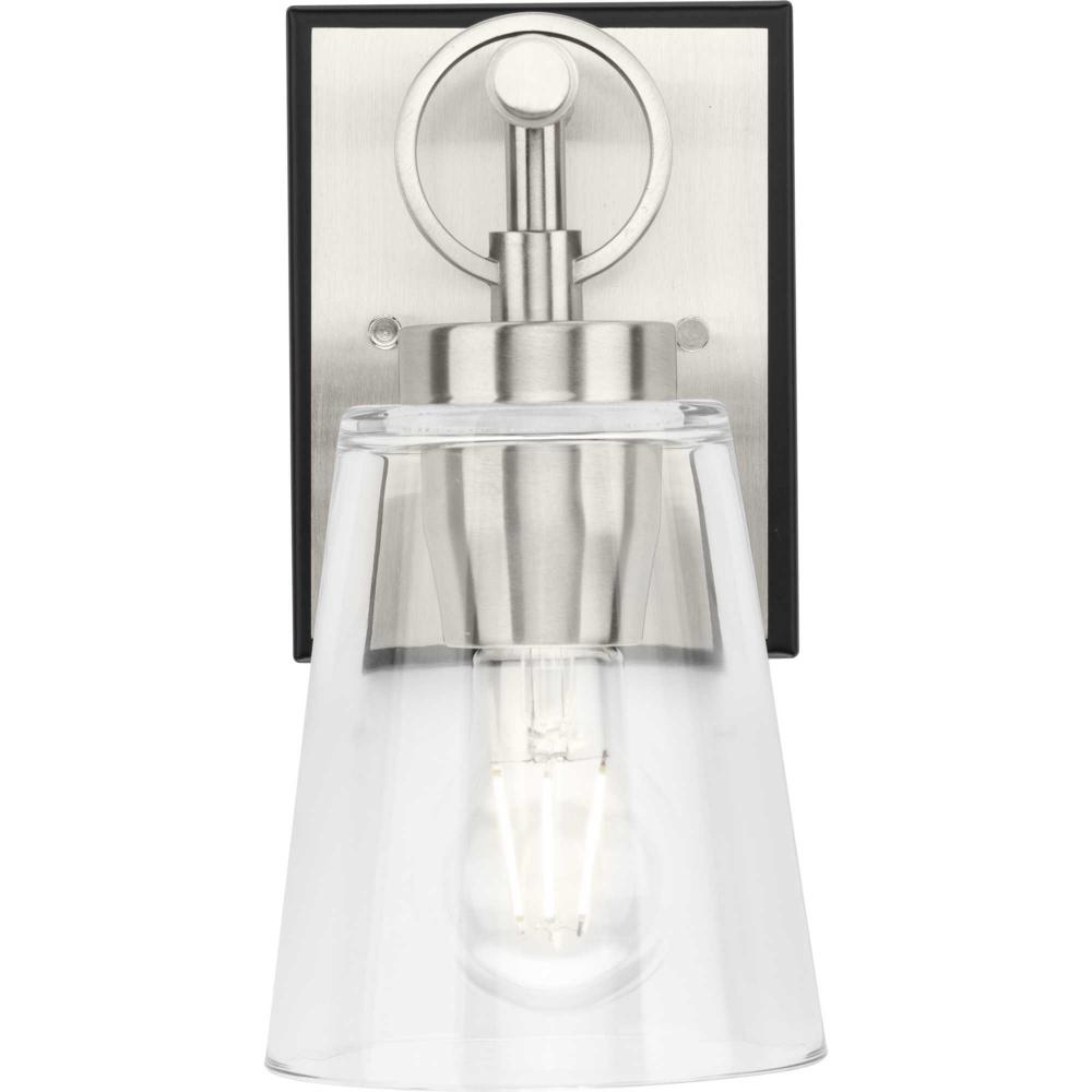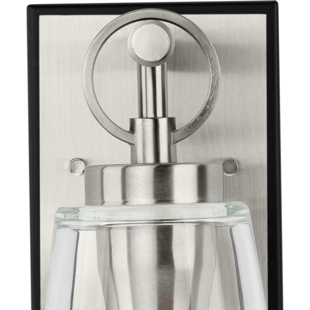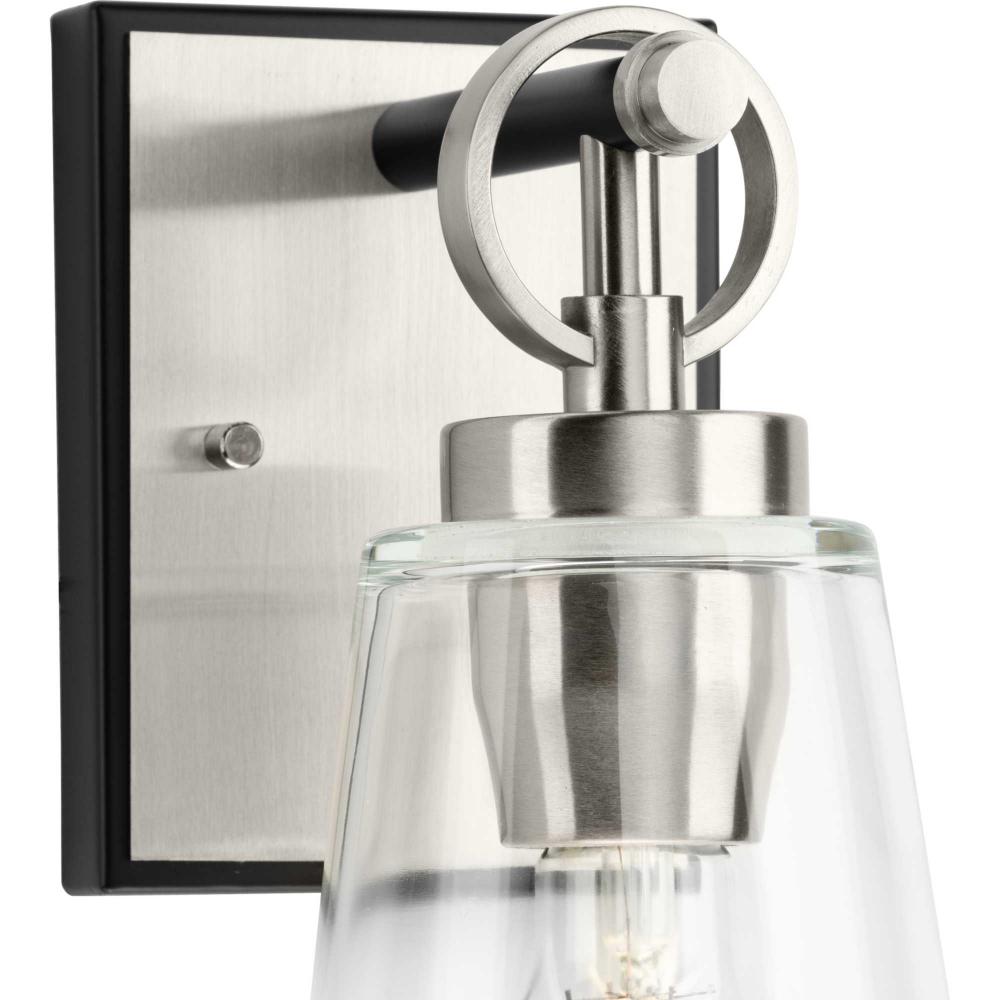 The Cassell One-Light Vanity Fixture brings an enduring style to the bath. The light boasts a dual-tone finish of Brushed Nickel and Matte Black that accentuates its distinguished and handsome design. Tailored details smoothly blend linear precision with an elegant circular ring and clear glass shade.