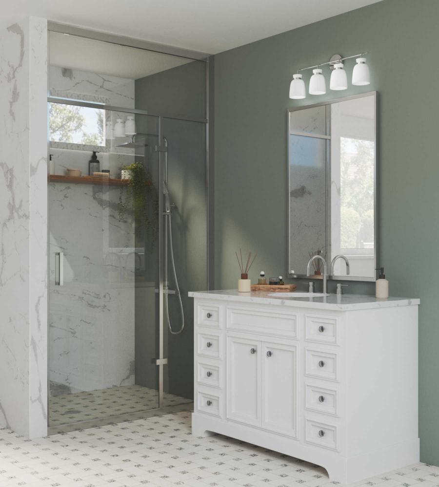 The Lexie Four-Light Vanity Light is full of spunk with a fresh new style for todays home. A slender minimalist frame finished in Polished Chrome supports opal glass shades with a distinctive cinched metallic collar.The versatile fixture can be mounted facing up or down, offering the perfect amount of illumination to the room.