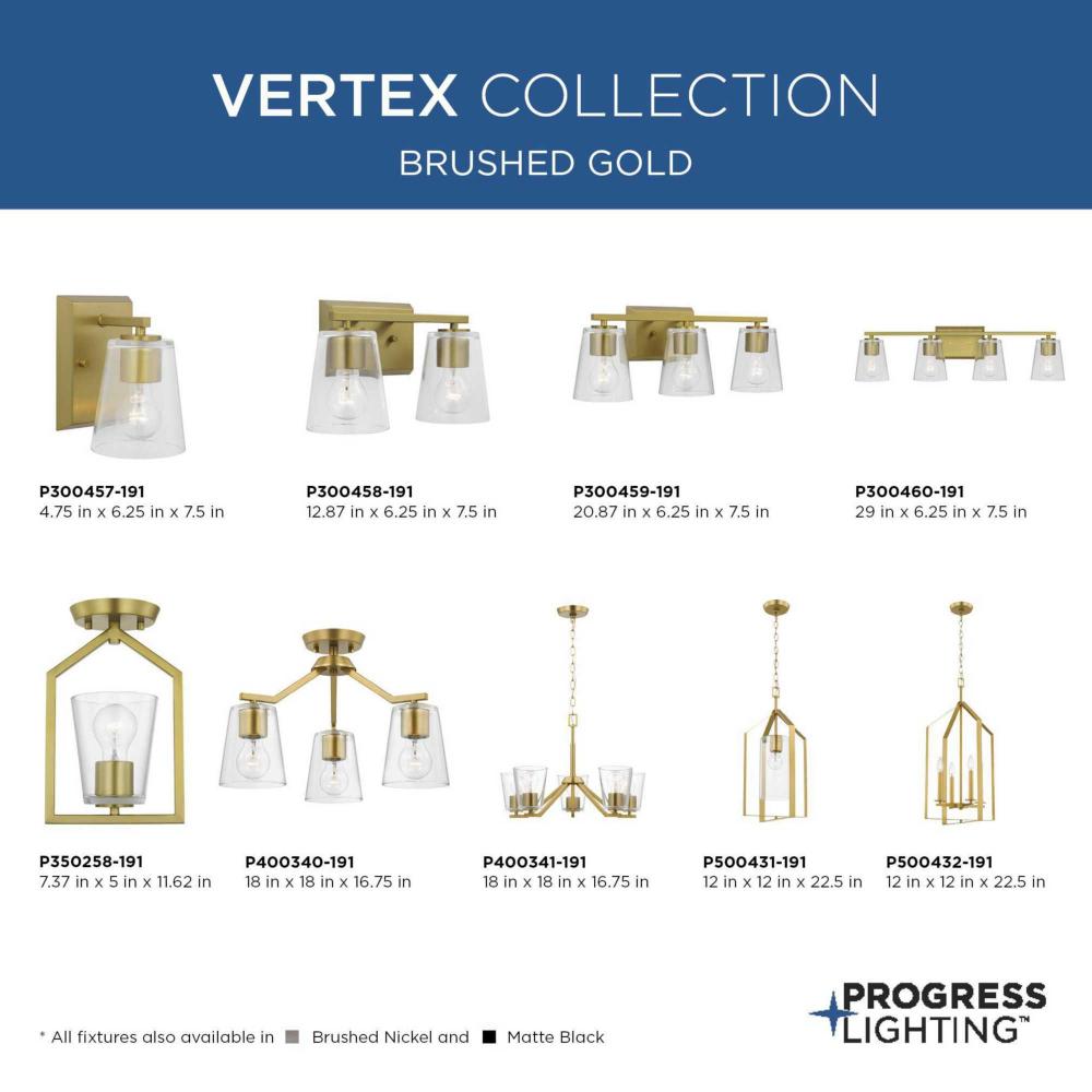 Elegantly extended, the Vertex Collection is composed of angular forms finished in soft brushed gold to create a bold design that perfectly complements modern interiors. Glass shades delivers bright illumination to bathrooms and powder rooms in contemporary settings. This versatile fixture can be mounted up or down, increasing its design flexibility. It is cULus damp rated and has a one-year warranty to guarantee your complete satisfaction. Progress Lighting products offer exceptional quality, reliability, and functionality. .
