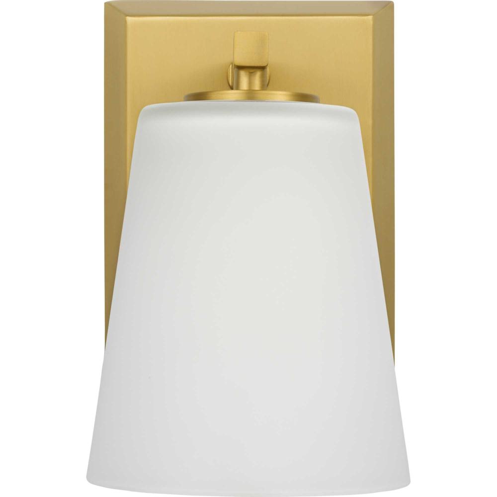 Elegantly extended, the Vertex Collection is composed of angular forms finished in soft brushed gold to create a bold design that perfectly complements modern interiors. Glass shades delivers bright illumination to bathrooms and powder rooms in contemporary settings. This versatile fixture can be mounted up or down, increasing its design flexibility. It is cULus damp rated and has a one-year warranty to guarantee your complete satisfaction. Progress Lighting products offer exceptional quality, reliability, and functionality. .