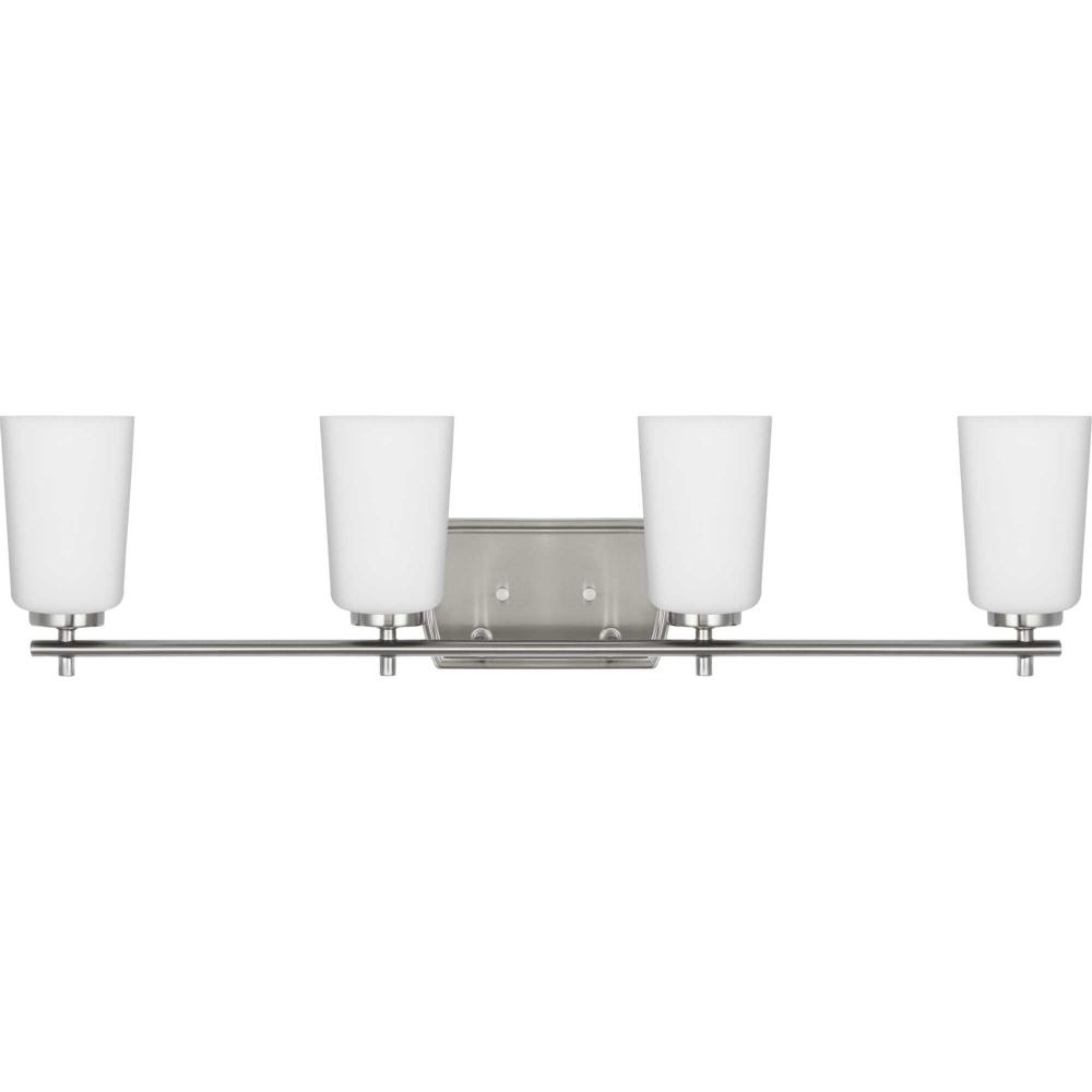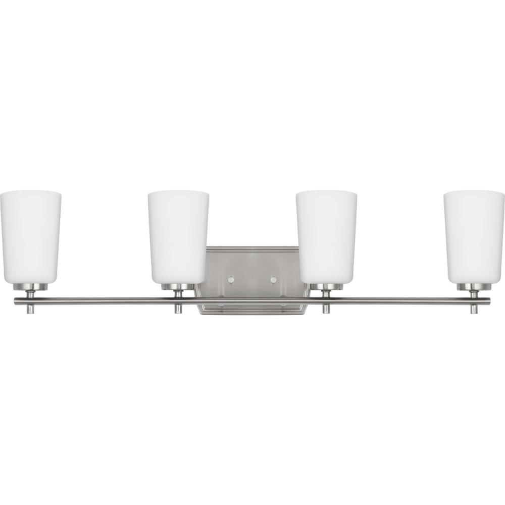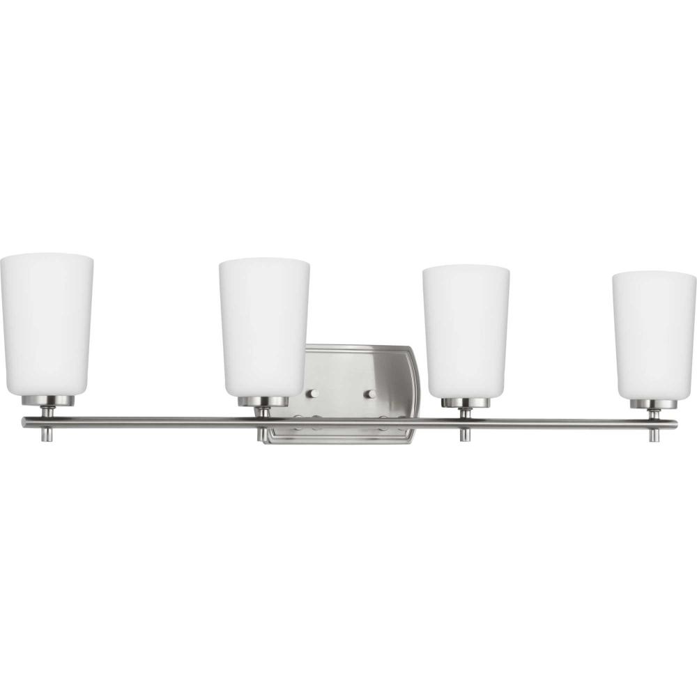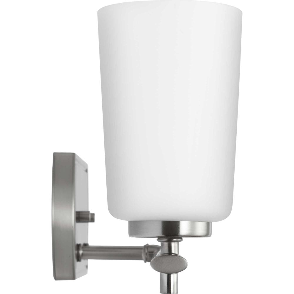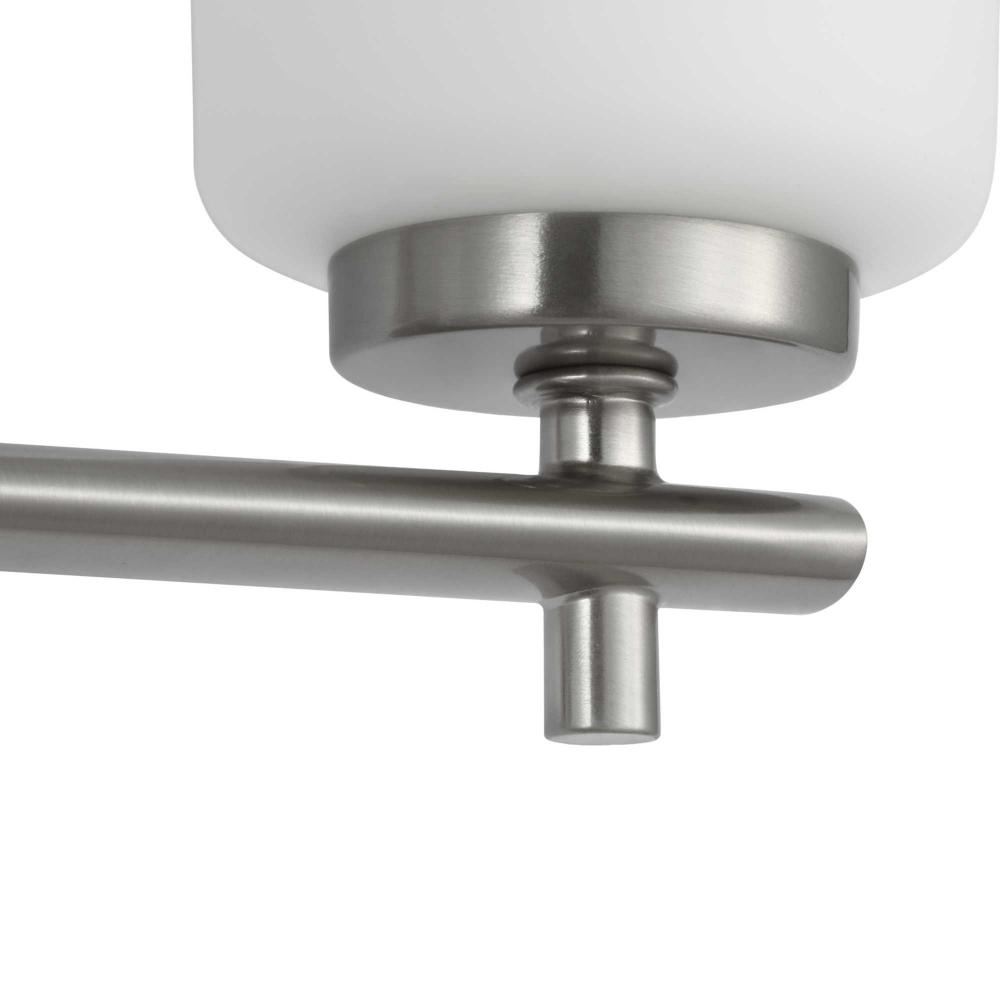 Fundamentally modern but with a traditional twist, the Adley vanity light combines opal glass shades with a curved edge backplate and a simple, straight bar finished in soft brushed nickel. This light is an elegant choice for illuminating new traditional and transitional settings.