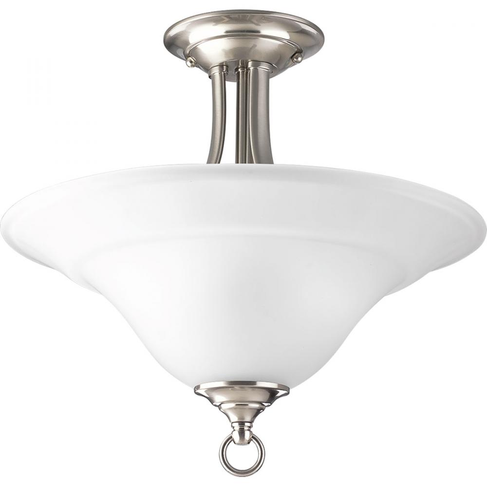 Two-light semi-flush close-to-ceiling fixture featuring soft angles, curving lines and etched glass shades. Gracefully exotic, the Trinity Collection offers classic sophistication for transitional interiors. Sculptural forms of metal and glass are enhanced by a classic finish. This transitional style can transform a room or your whole home with its charming versatility. Brushed Nickel finish.