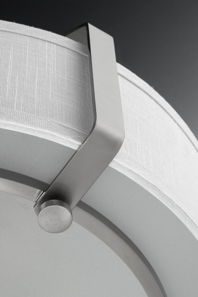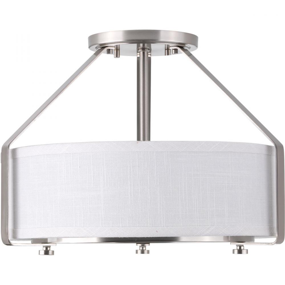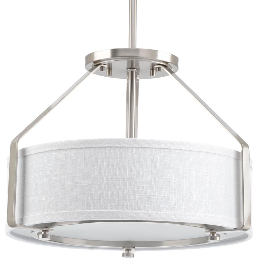 The three-light semi-flush offers a sleek metal frame that supports a low-slung shade to create Ratio’s casual modern style. The frame’s proportion to the white linen drum shade evokes a perfect ratio for lighting. Includes a polished glass exterior, etched glass interior diffuser that offers an elegant appeal and is easier to clean – offering both fashion and function. This fixture can be mounted as a semi-flush or used as a hanging pendant for a wide variety of applications. Brushed Nickel finish.