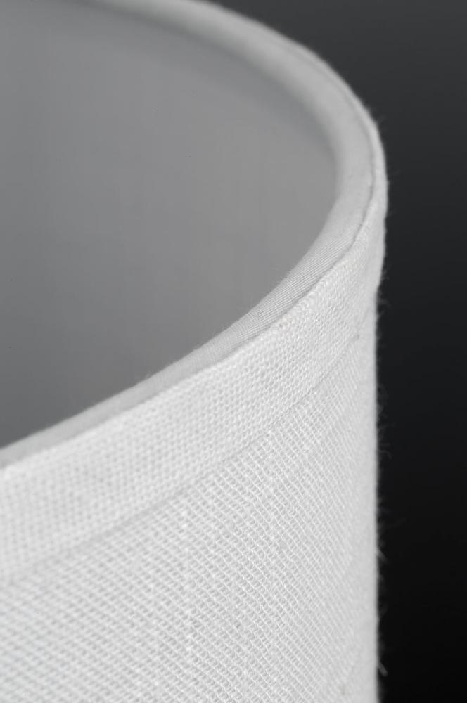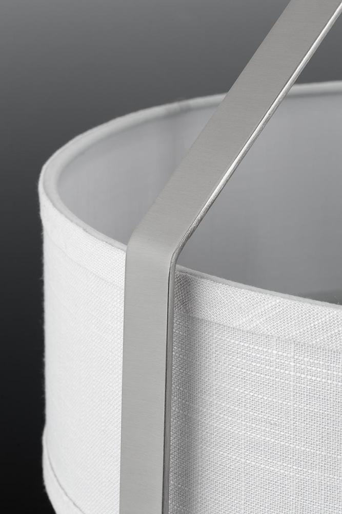 A sleek metal frame supports a low-slung shade.;The frame's proportion to the white linen drum shade evokes a perfect ratio for lighting.;Polished glass diffuser that offers an elegant appeal and is easier to clean.;Offers both fashion and function wit