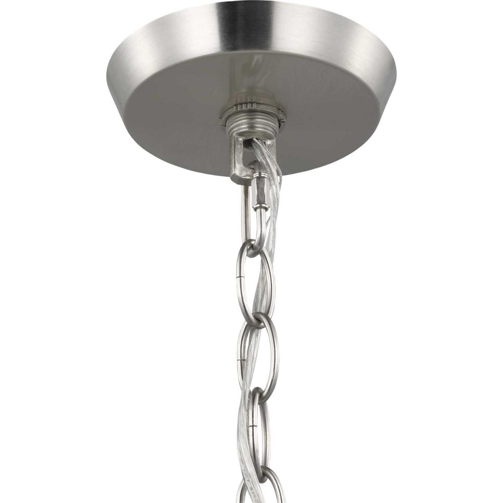 Elegantly extended, the Vertex chandelier is composed of angular forms to create a bold design that perfectly complements dining rooms and living rooms in modern interiors. Its distinctive silhouette is coated in a soft brushed nickel finish. An etched glass shade offers bright illumination to spaces below. Customize the chandelier's hanging height to your ceiling using the Included 48 in. of chain for a variety of ceiling heights and sloped ceilings.