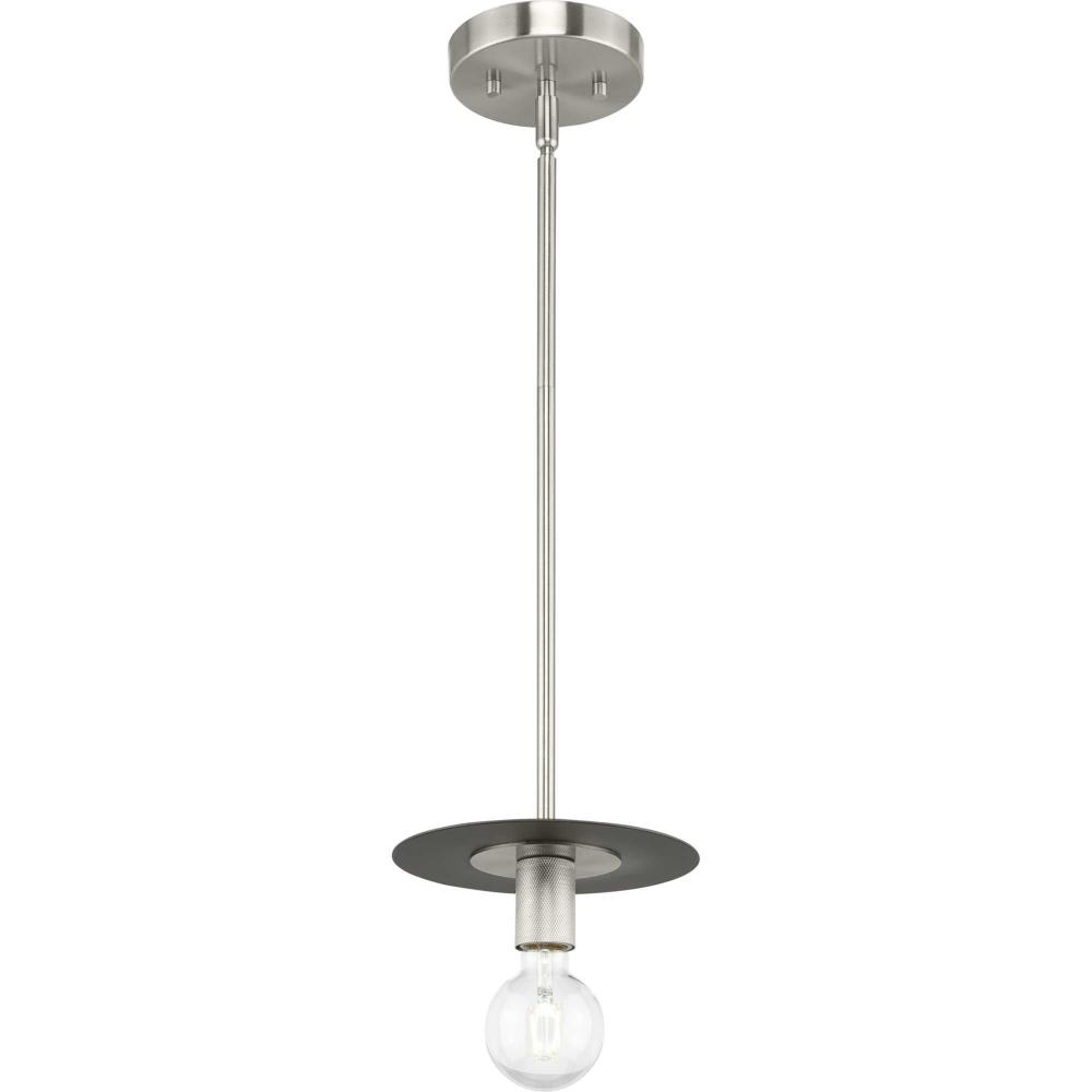 An intriguing flat disc shade forms the basis of the Trimble Collection, whose mid-century modern inspiration is perfect for open spaces in mid-century modern and luxe industrial settings. A two-toned finish on the shade features subtle brushed nickel and crisp graphite, plus a knurled metal lamp socket is coated in brushed nickel providing additional rich visual interest. Use vintage-style bulbs to add modern appeal and to cast crisp illumination to kitchens, bars and breakfast nooks.