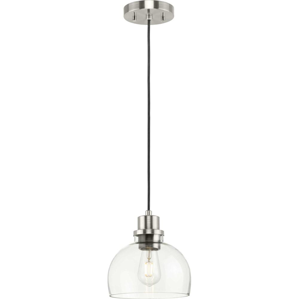 The pendant features a round clear glass shade with a metal cap and canopy finished in brushed nickel