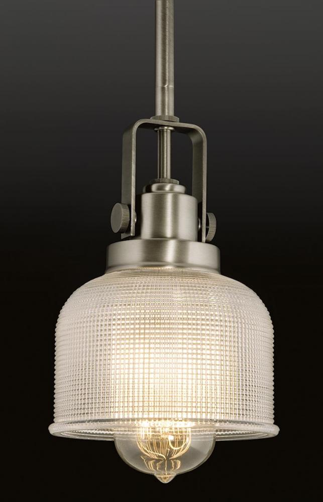 The Archie Collection brings a vintage, industrial flair to interior settings. The collection’s distinctive double prismatic glass adds visual interest as its crisscross pattern comes to life when illuminated. The distinctive finely crafted strap and knob detail adds authentic industrial flair. This one-light mini-pendant is perfect for kitchens, dining rooms, rec room and anywhere pendants could be used. Venetian Bronze finish.