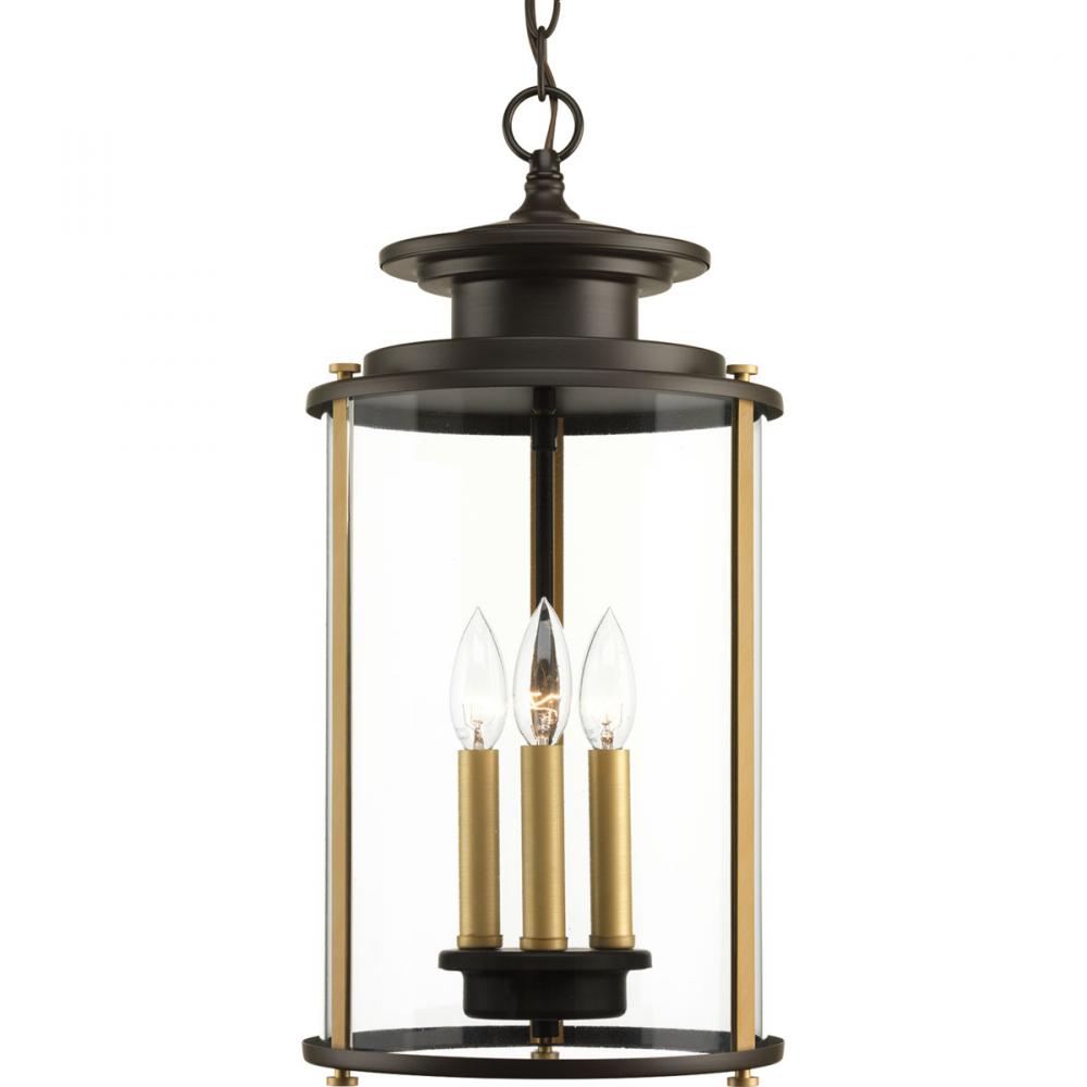 Squire three light hanging lantern features a classic traditional profile with clean, modern metal fittings. The Antique Bronze finish is accented with contrasting Vintage Brass metallic elements, the cylindrical frame is comprised of a clear glass diffuser.