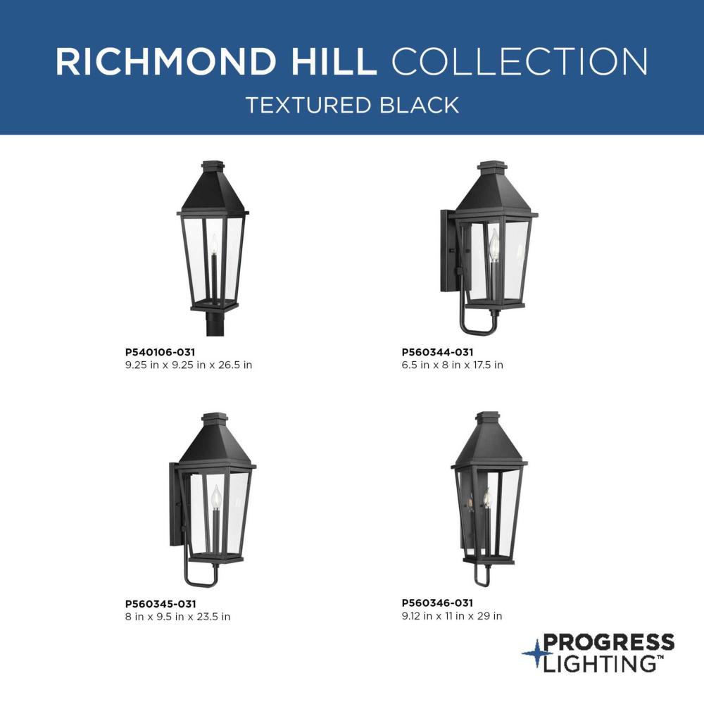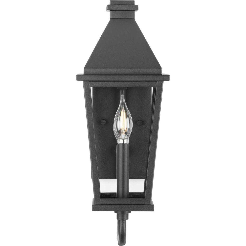 Inspired by vintage glass lanterns, the Richmond Hill Collection has a slender, tall profile and crisp angular details coated in a classic textured black finish. A stately candle enclosed within clear glass panes highlight's the elongated, tapered design while delivering crisp illumination. The updated traditional design of thiswall lantern offers fresh style to the outdoor patios, porches and other outdoor or indoor settings of modern farmhouse and transitional homes. It is cULus wet location listed for use where water may be present, with a one-year warranty to guarantee your complete satisfaction. Progress Lighting products are designed for exceptional quality, reliability, and functionality.