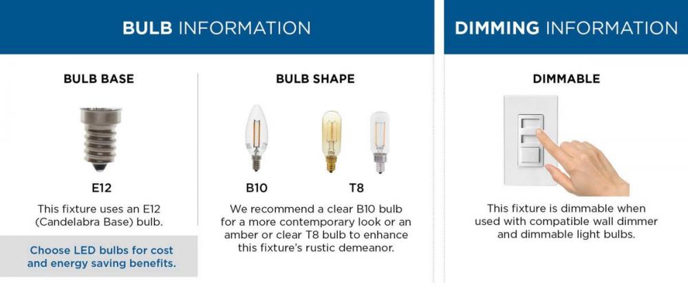 Uses (1) 60-Watt maximum, candelabra base bulb or LED equivalent, that is sold separately, and dimmable when used in conjunction with a dimmable bulb