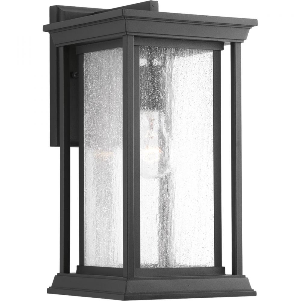 Features a Craftsman-inspired silhouette;An outdoor lantern with an elongated frame.;Frame is finished with clear seeded glass;Black finish.