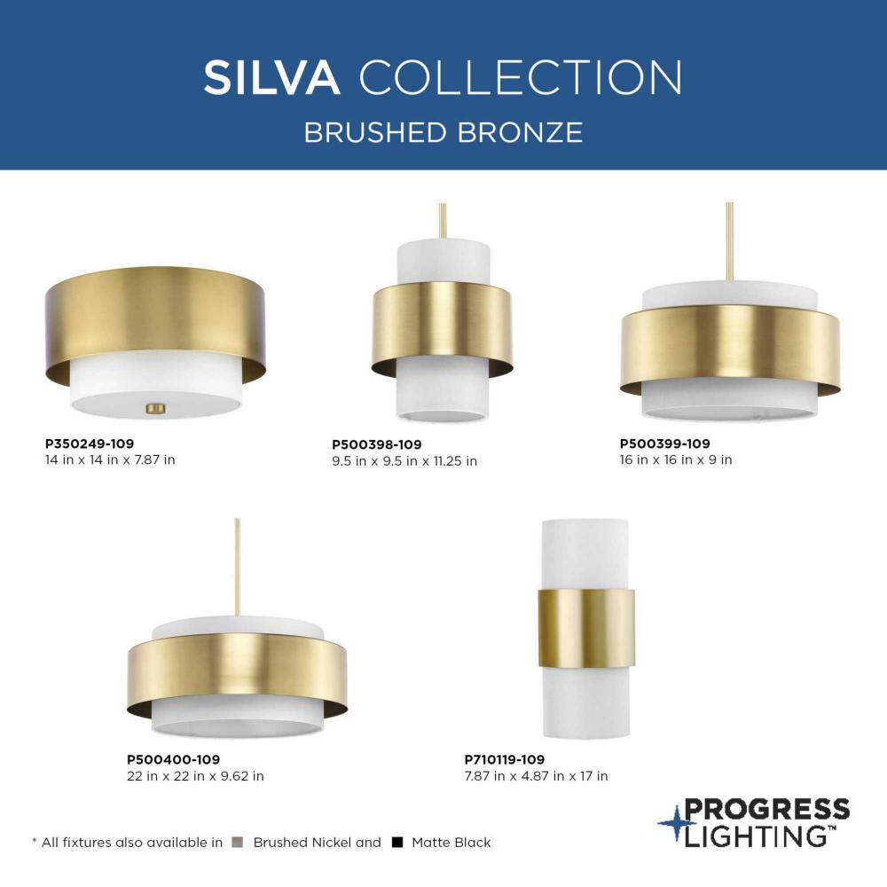 The Silva Collection uses a dramatic contrast of finish and material to present a captivating design. A white linen shade encompassed by a stunning metallic drum coated in a beautiful brushed bronze finish establishes a clean, modern, uplifting statement. This fixture is part of the Progress Lighting Design Series, a lighting collection offering fashionable styles and affordable luxury lighting for the home.