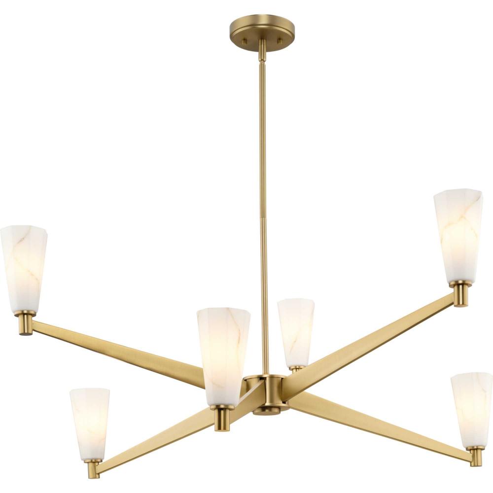 The Tosca Collection exudes a sense of motion from gracefully tapered arms that transcend traditional design boundaries. The Brushed Bronze chandelier holds geometric glass shades crafted with a faux alabaster finish that radiate patterns of light and shadow, adding depth and warmth that enchant any room. This fixture is part of the Progress Lighting Design Series, a lighting collection offering fashionable styles and luxury lighting for the home.
