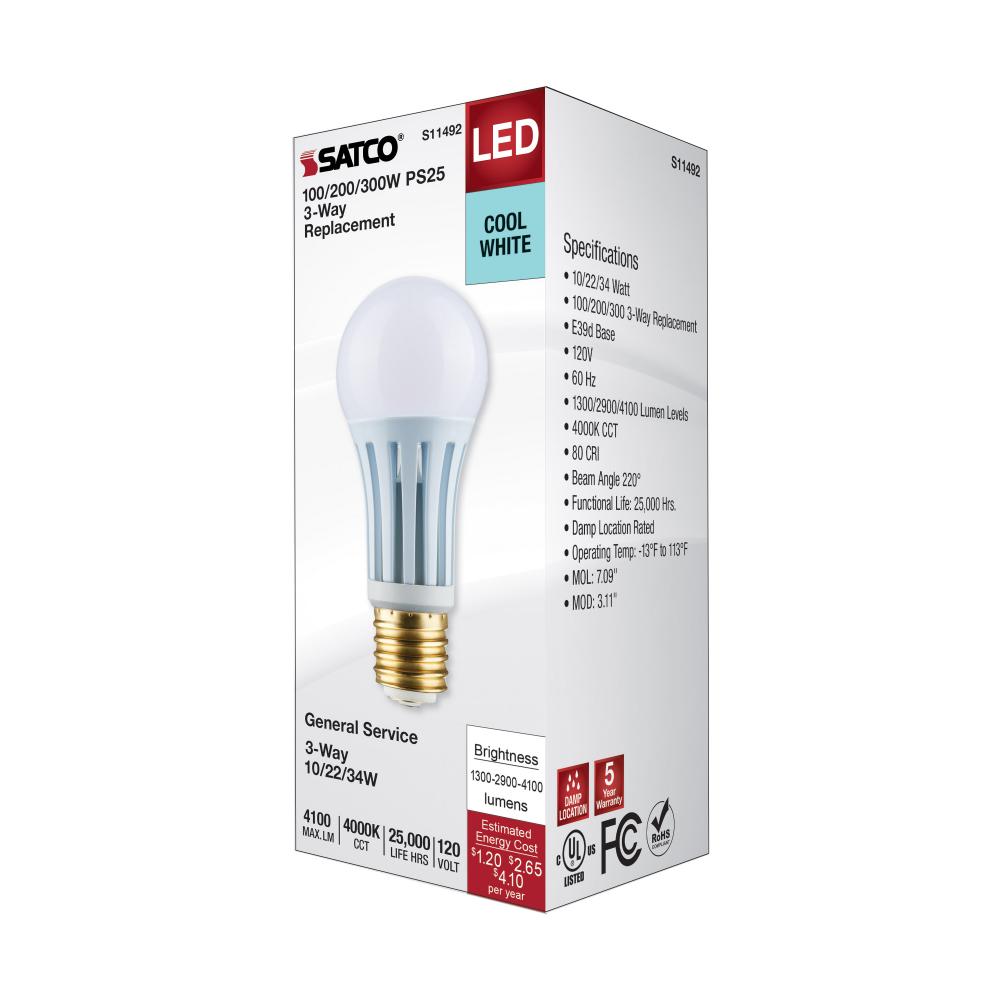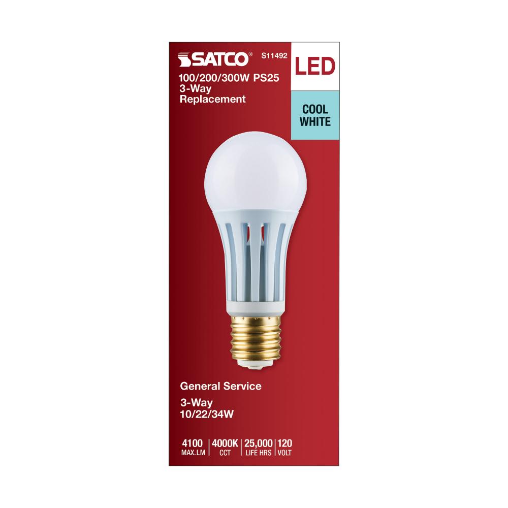10/22/34 Watt PS25 LED Three-Way Lamp; E39d Mogul Base; 4000K; White Finish; 120 Volt by Satco Products Inc.