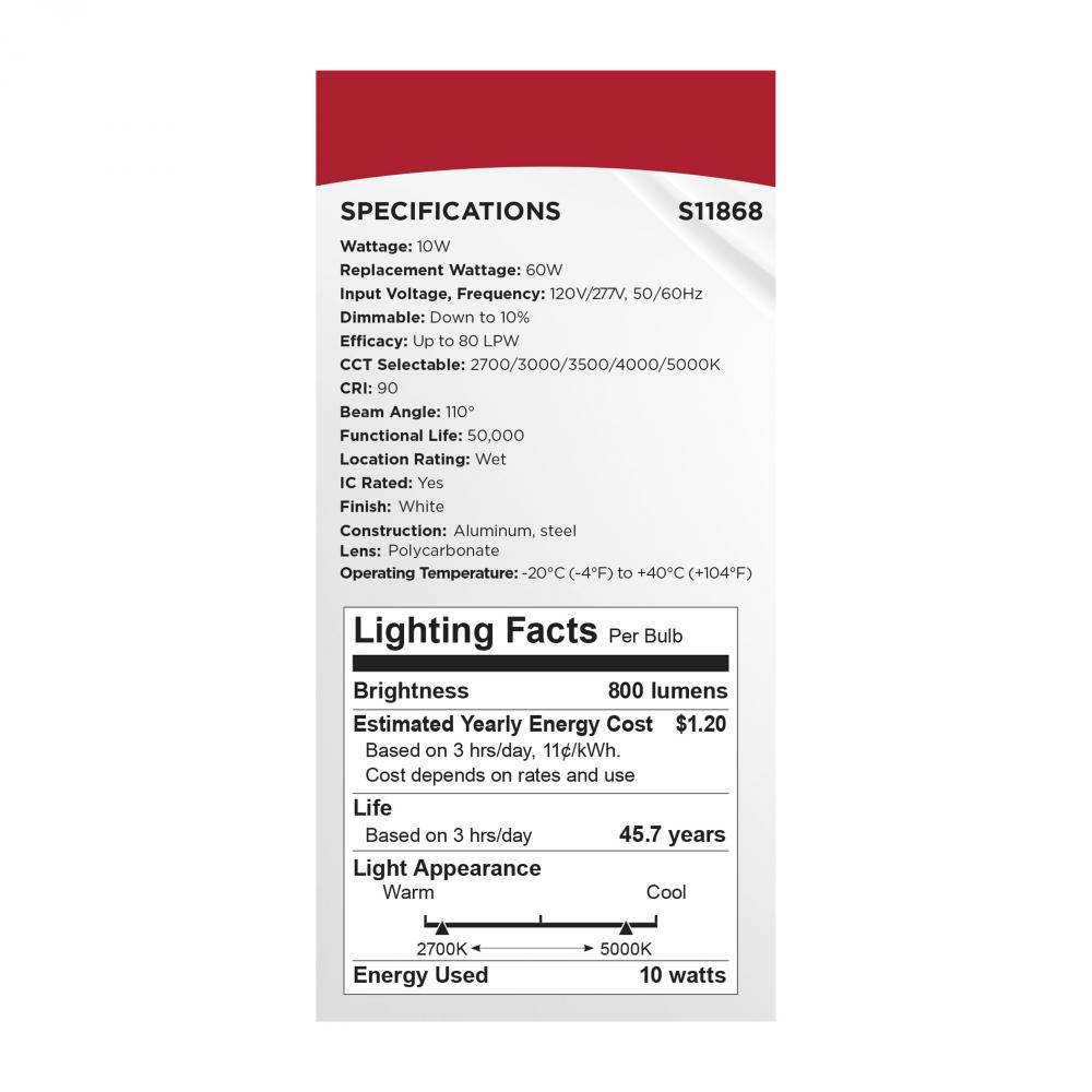 10 Watt LED; Fire Rated 4 Inch; Direct Wire Downlight; Round Shape; White Finish; CCT Selectable; by Satco Products Inc.