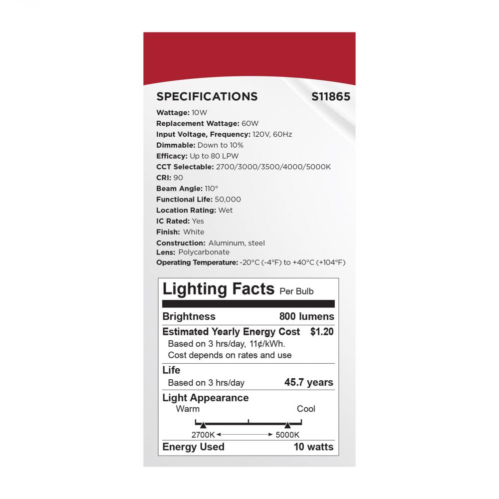 10 Watt LED; Fire Rated 4 Inch Direct Wire Downlight; Round Shape; White Finish; CCT Selectable; 120 Volts; Dimmable; Remote Driver