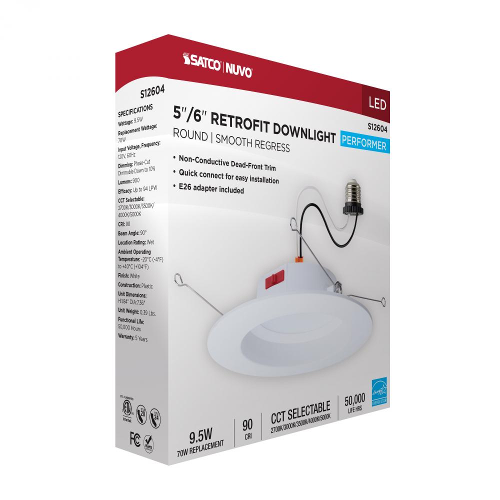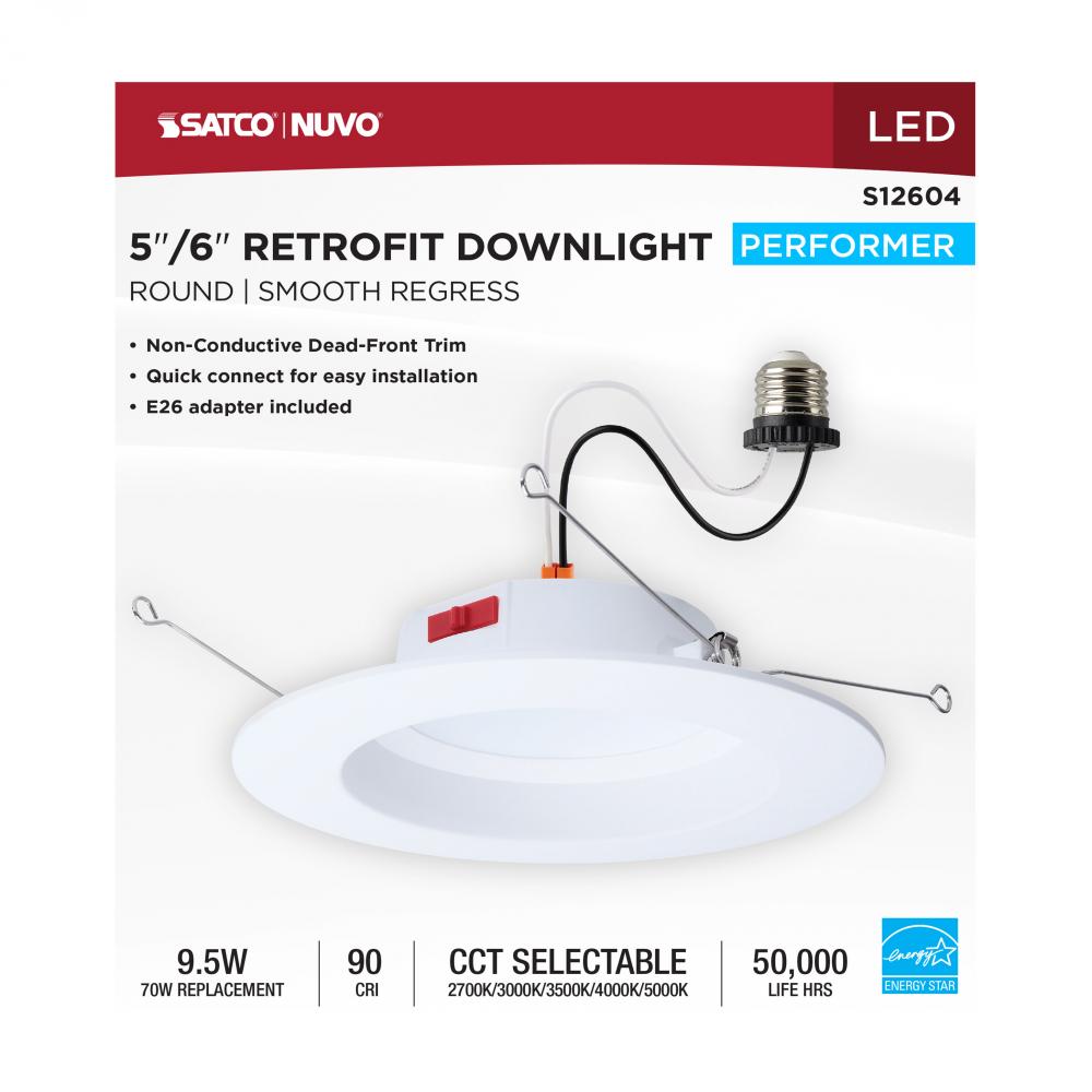 SATCO NUVO's S12604 5/6-inch round, 9.5W, Performer Series LED Retrofit Downlight combines effortless installation with a sleek, functional design. Its smooth regress baffle minimizes glare, while the integrated on-unit switch allows easy selection fro