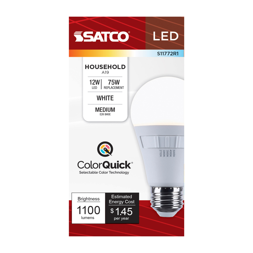 12 Watt A19 LED; 27K/3K/35K/4K/5K CCT Selectable; Medium Base; White Finish; 120 Volt by Satco Products Inc.