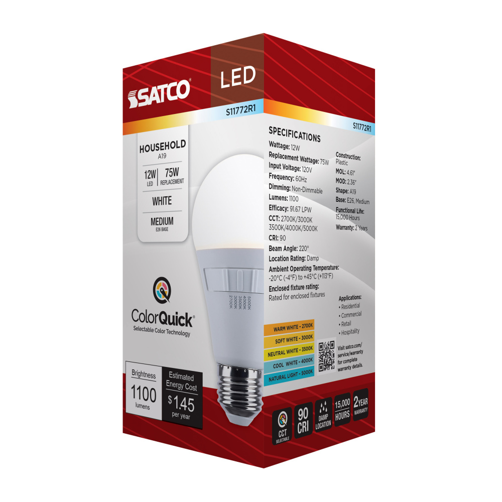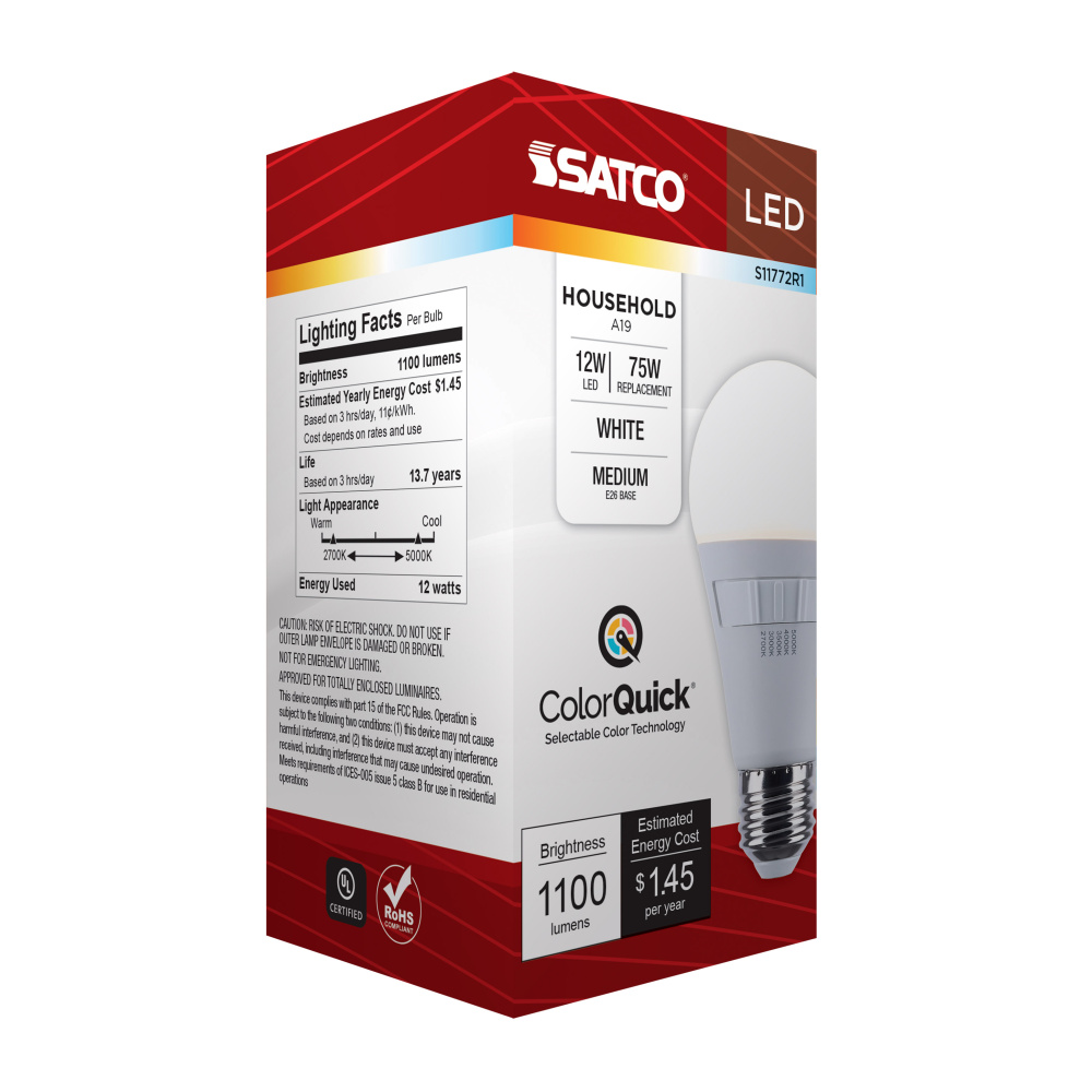 Elevate your everyday lighting with SATCO NUVO's S11772R1 12W LED A19 bulb-designed for flexibility, clarity, and dependable performance. With 5 CCT selectable options from a cozy 2700K to a vibrant 5000K, you can tailor the ambiance to suit any enviro