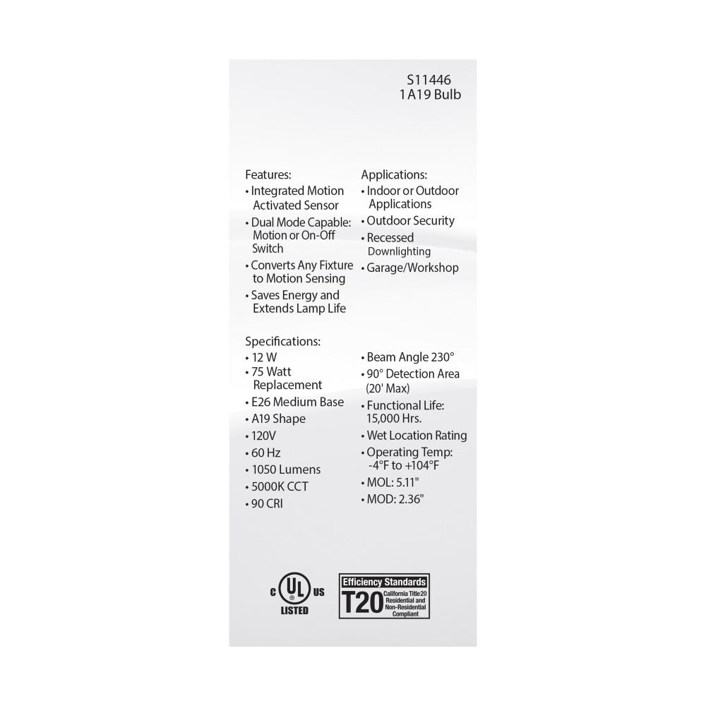 12 Watt A19 LED; White; 5000K; 1050 Lumens; 120 Volt; PIR Sensor; Non-Dimmable