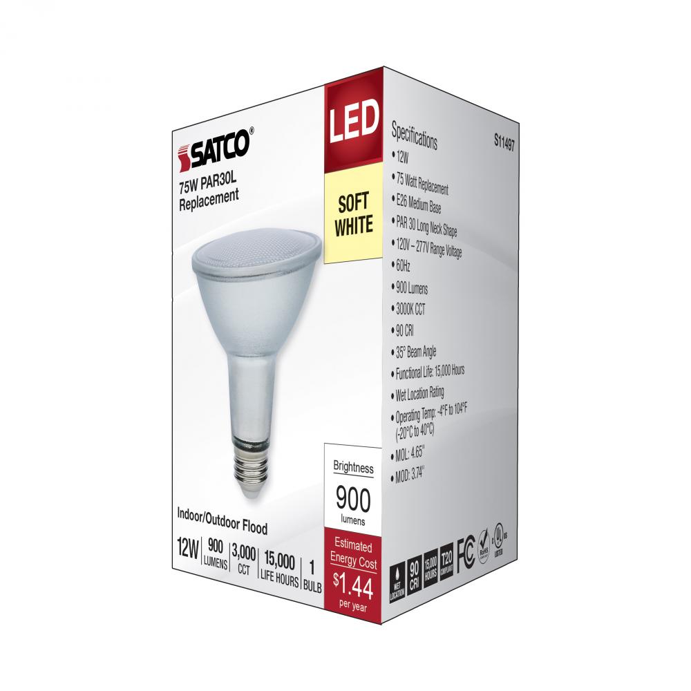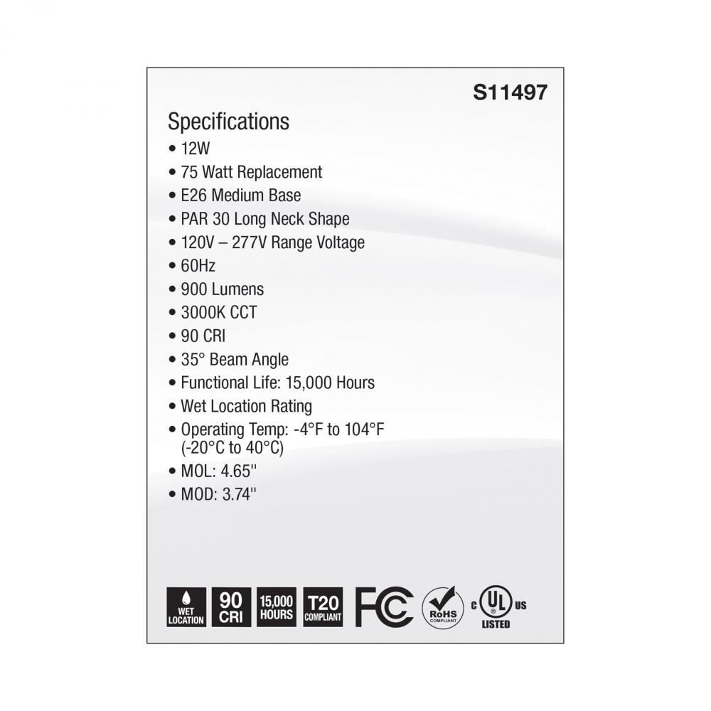 SATCO NUVO's S11497 PAR30 Long Neck Range Voltage lamp is designed for application in 120V-277V fixtures. With crisp, 90 CRI light output in 3000K, this is an ideal lamp for residential commercial, hospitality, general lighting, recessed downlighting a