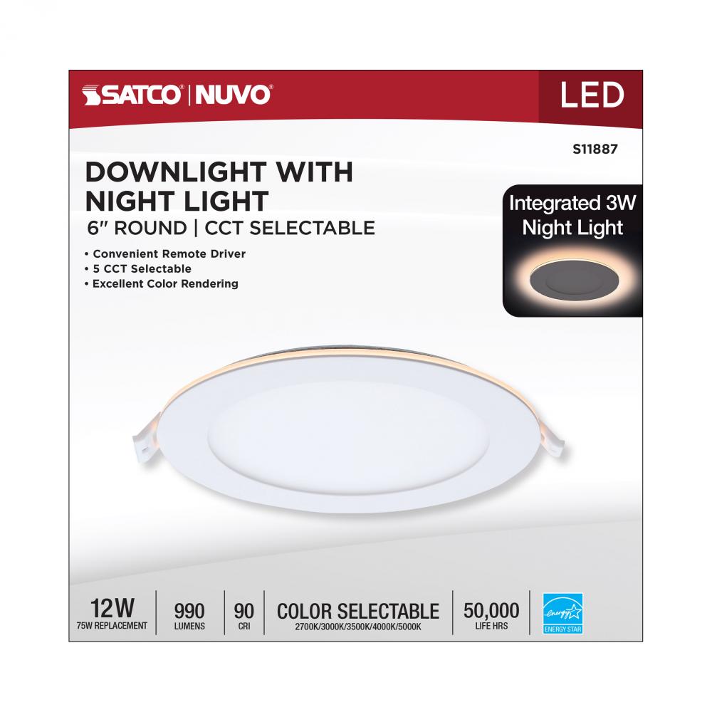 SATCO NUVO's LED 6-inch Round Downlights with Integrated Night Light provide a classic downlight with night light for additional ambiance control. Choose from five warm to cool CCTs at installation, connect an optional dimmer, or switch on-off-on at th