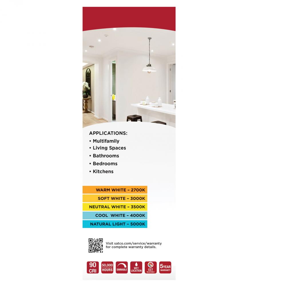 SATCO NUVO's LED CCT Selectable 5-6 inch High Lumen Retrofit Downlight will elevate the lighting in any space. Designed with impeccable 90 CRI color rendering, you can make your space brighter while saving energy with this 1,100 high lumen LED downligh
